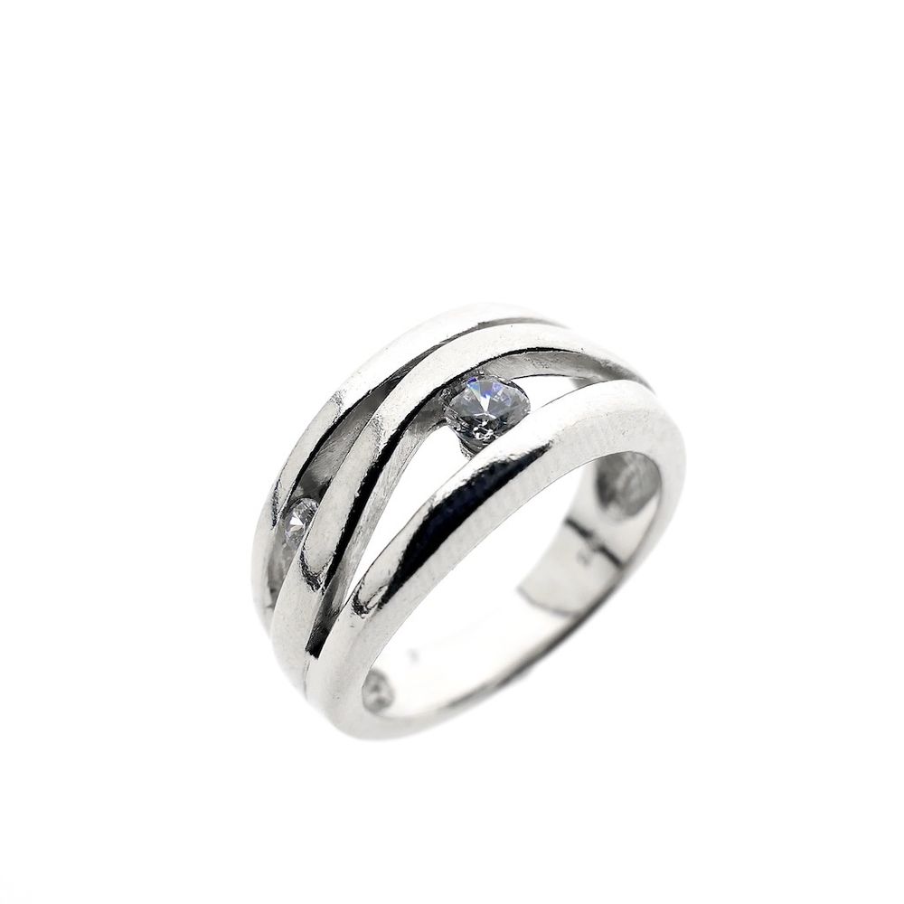 Silver women's ring. The ring features a wavy design with two round, brilliant-cut zirconia stones set within it. The ring is made of premium silver (925/1000).