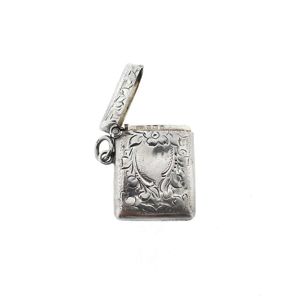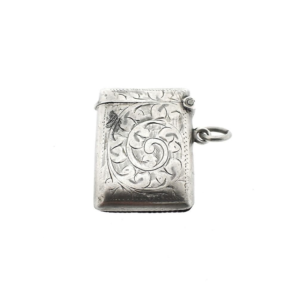 Silver matchbox with a floral pattern. The box was made in England from 925/1000 sterling silver. It was made in Birmingham in 1906. The matchbox shows some signs of wear, but is still very beautiful and unique. This box was once used to store small matches; the bottom has ridges for striking. This object was popular in the 20th century. (The predecessor to the matchbox was the tinderbox; before matches existed, a highly flammable material was stored in a similar box.)