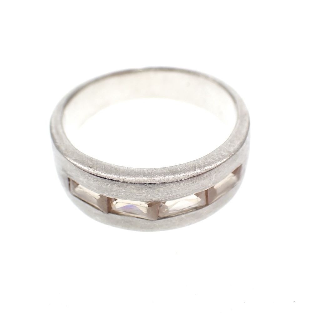 A wide, matte silver ring. The ring is set with four peach-colored zirconia stones. It has a modern design and is made of premium silver (925/1000).
