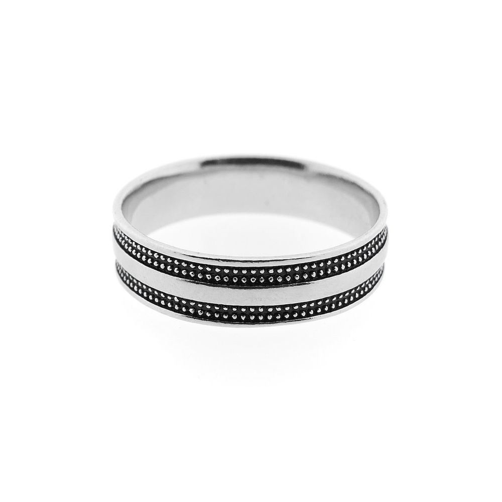 Patinated silver men's ring. This ring has a rugged look with two black patinated rows of delicate silver details. The ring is made of 925/1000 sterling silver. The silver is artificially patinated with liver of sulfur (potassium polysulfide, a flash stain), after which the patinated portion turns black.