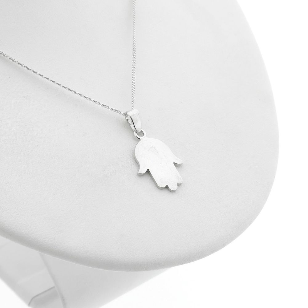 Silver pendant of a Hamsa hand. The pendant is made of the highest quality silver (925/1000). The Hamsa hand brings its owner luck, goodness, abundance, fertility, and good health. The hand can be made with the fingers pointing up or down. The Hamsa hand, also called the Hand of Fatima, originates from the Middle East. It symbolizes the Hand of God. Source: Google.