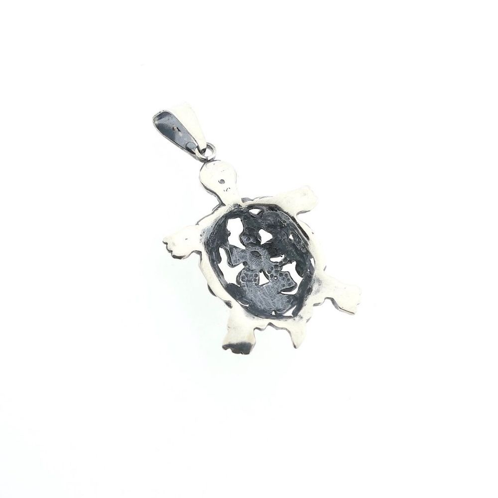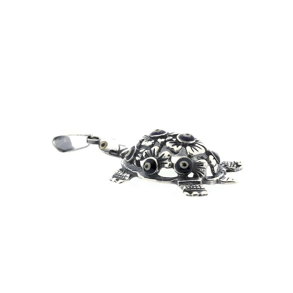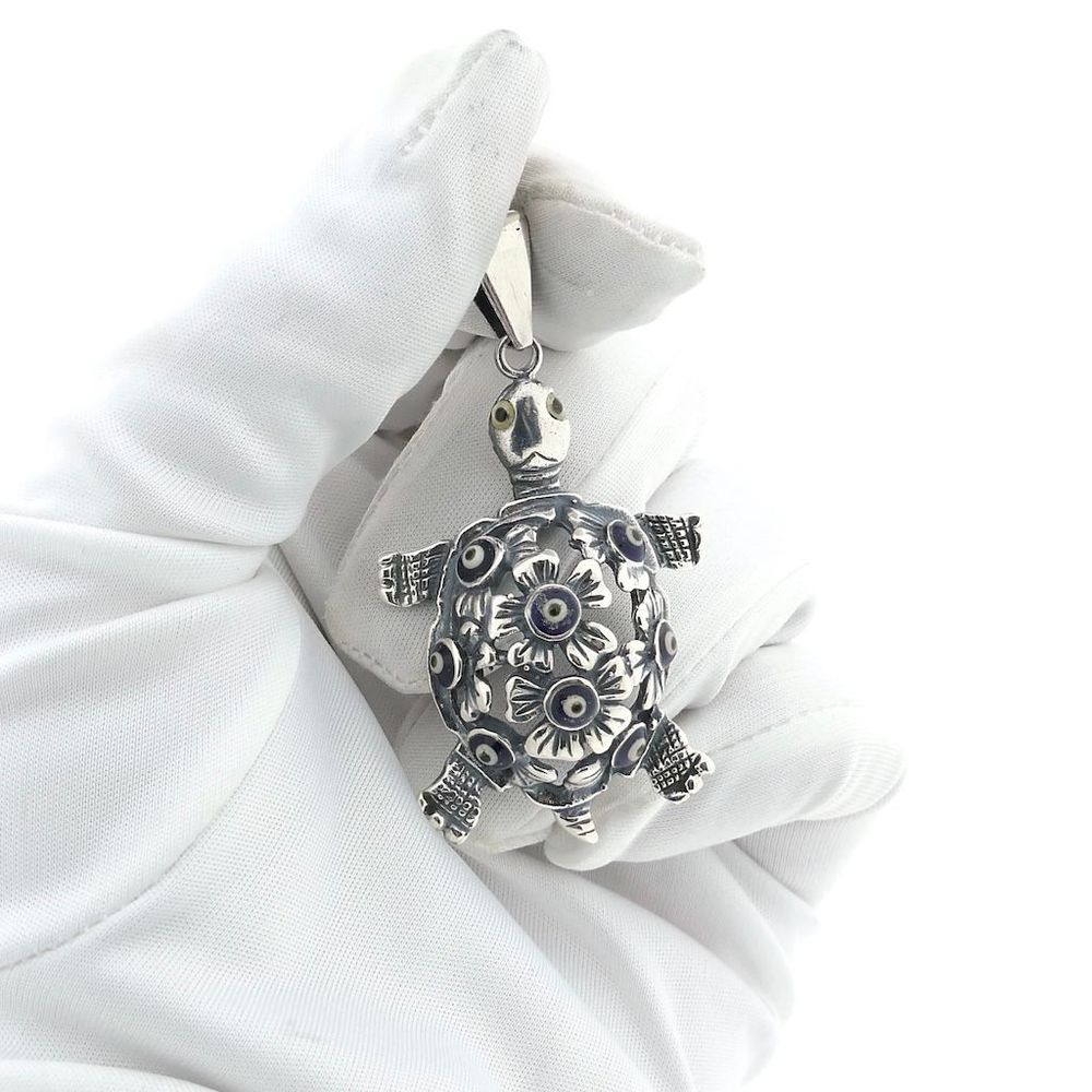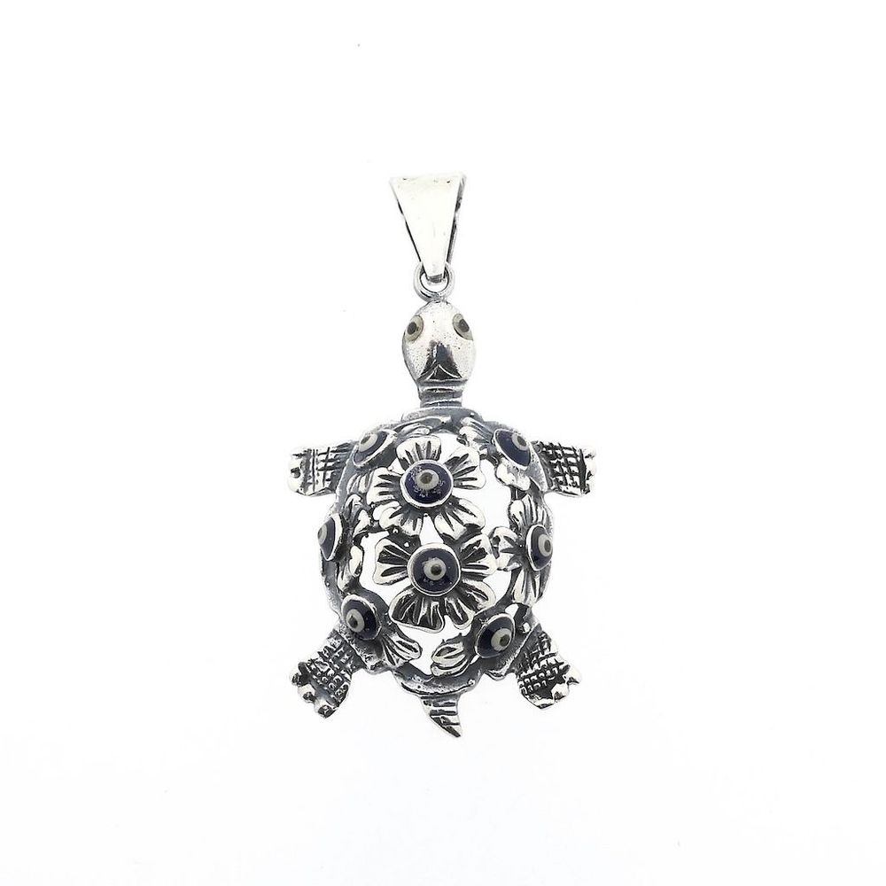 Silver turtle pendant. The shell is designed with floral motifs and detailed with Turkish enamel eyes. The pendant is made of first-grade silver (925/1000).