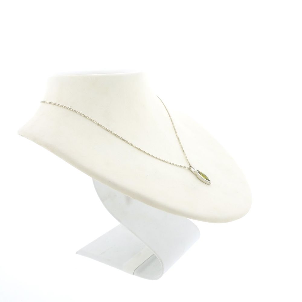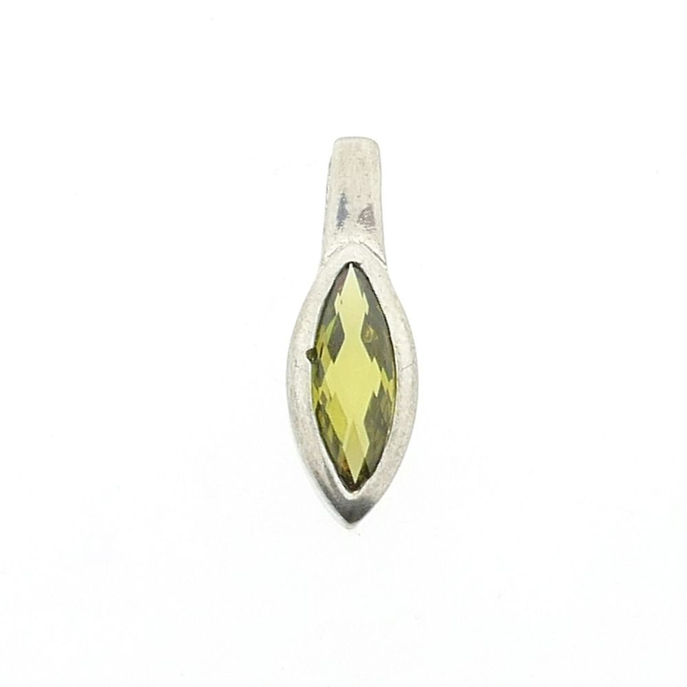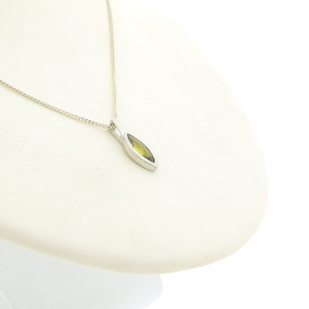 Silver pendant set with green zirconia. The zirconia is marquise-cut and sparkles in the light. The pendant is made of 925/1000 sterling silver.