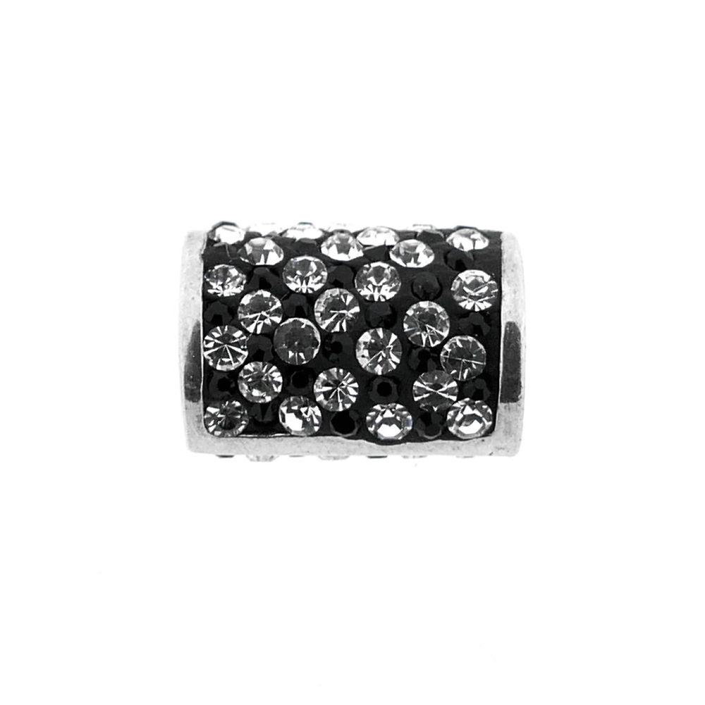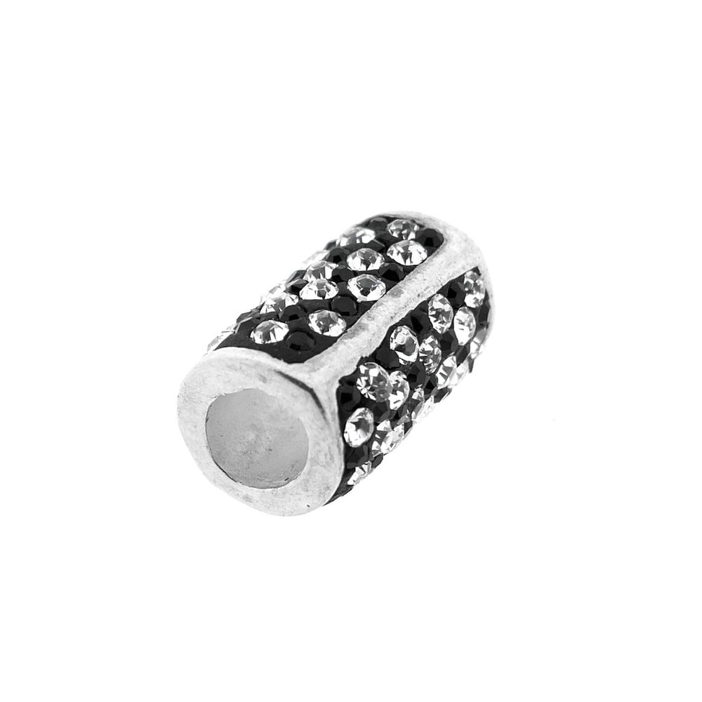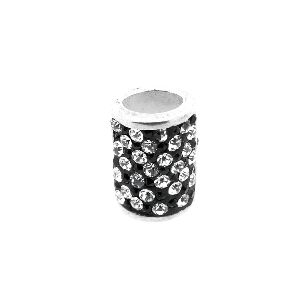 A silver pendant with a tube set with cubic zirconia stones. The zirconia is interspersed with black and white stones. The pendant can also be worn as a beard bead and is made of 835/1000 silver.