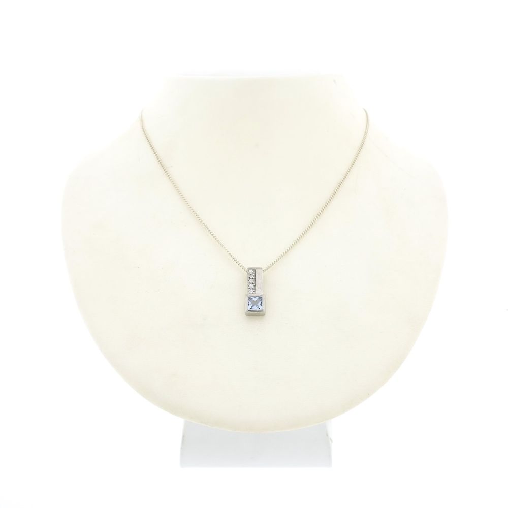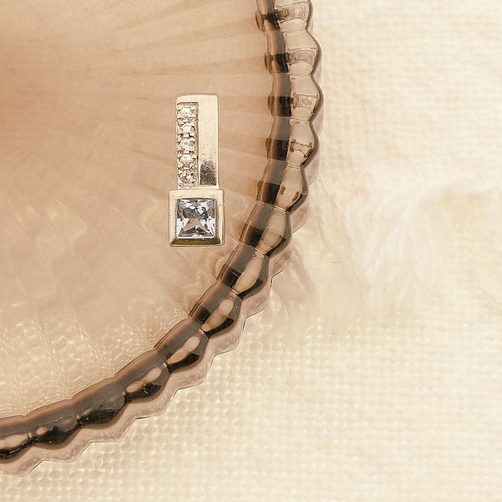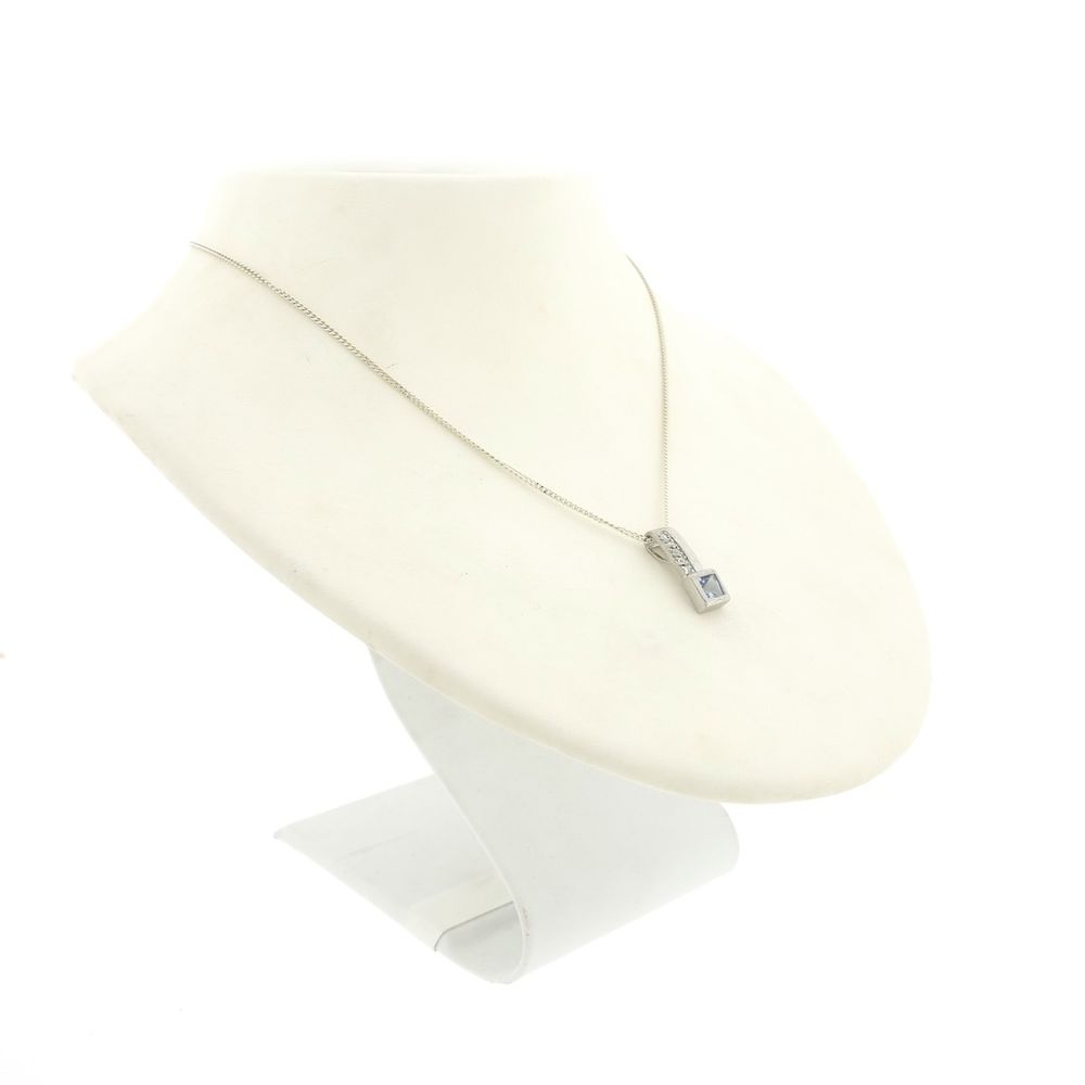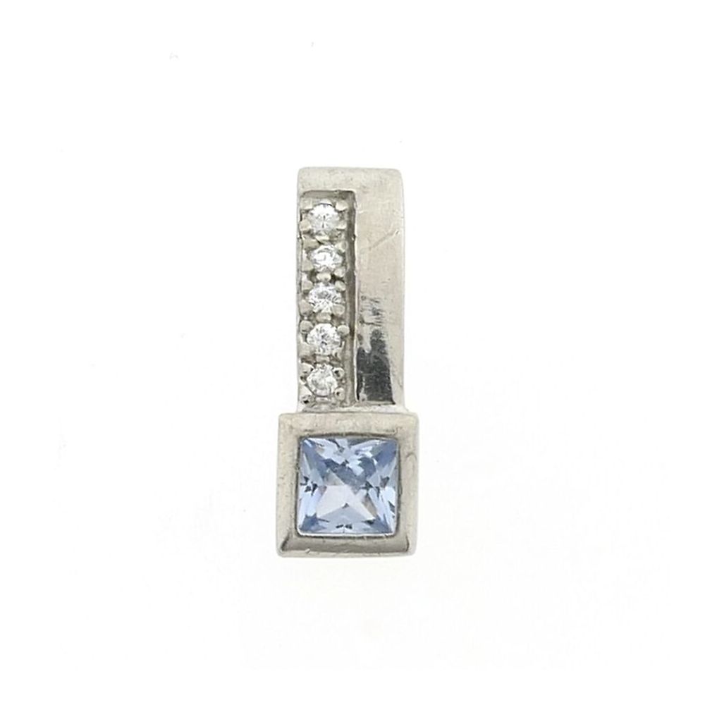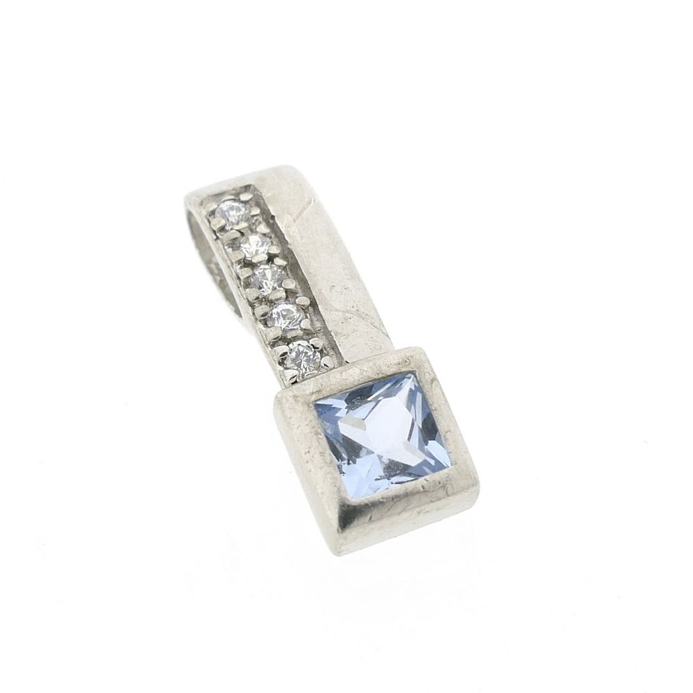 Silver pendant set with bright white and blue cubic zirconia stones. The blue cubic zirconia is square-cut and sparkles in the light. The pendant is made of premium silver (925/1000).