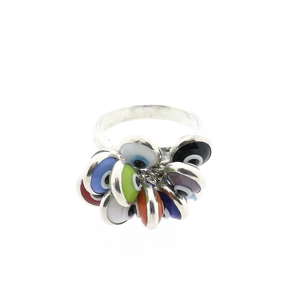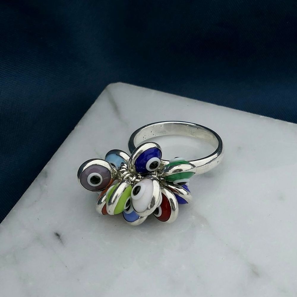 Silver ring with multiple colored Nazar eye charms