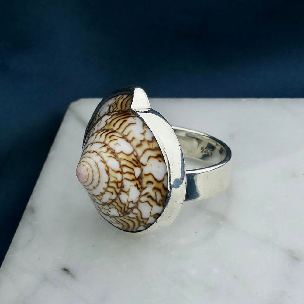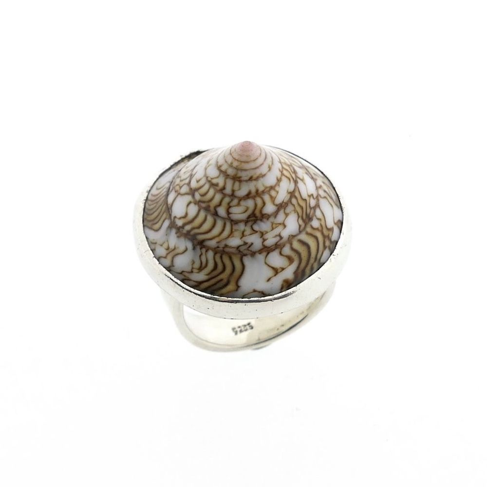 Silver ring with a cone snail shell. This sea snail is known for its intricate, textile-like pattern on its shell and is notorious for its extremely venomous sting. A special and unique ring crafted from premium silver (925/1000).
