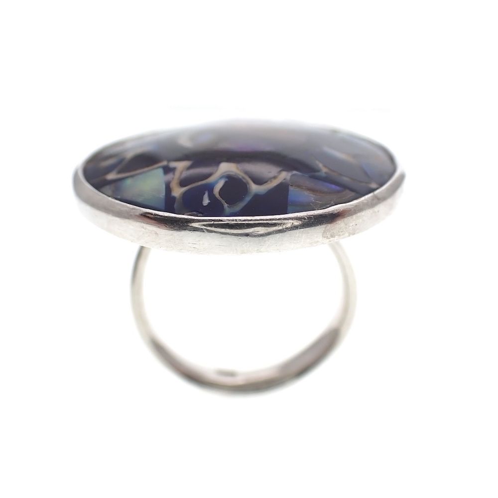 Silver ring detailed with a combination of mother of pearl and enamel. The ring has a beautiful fantasy design and is made of first-grade silver (925/1000).