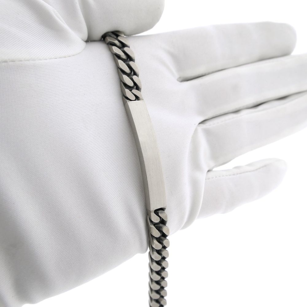 A robust silver gourmet link bracelet with an engraved plate for men. The matte-finished, coarse links create a robust look and have a link width of 7.5 mm. The bracelet is crafted from 835/1000 sterling silver and closes with an American hook. Would you like a name engraved on the plate? We can! Contact us and inquire about the options and costs via WhatsApp or phone.