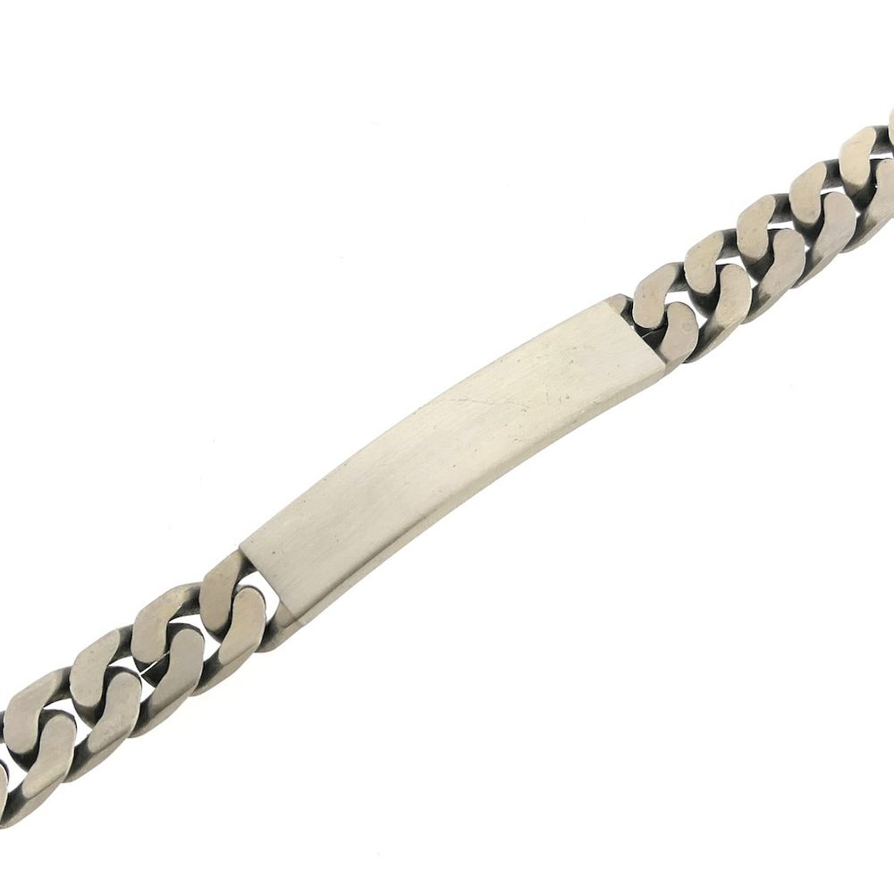 A robust silver gourmet link bracelet with an engraved plate. The matte-finished, coarse links create a robust look and have a link width of 9.1 mm. The bracelet is crafted from 835/1000 sterling silver and closes with an American hook. Would you like a name engraved on the plate? We can! Contact us and inquire about the options and costs via WhatsApp or phone.