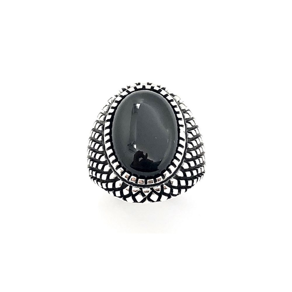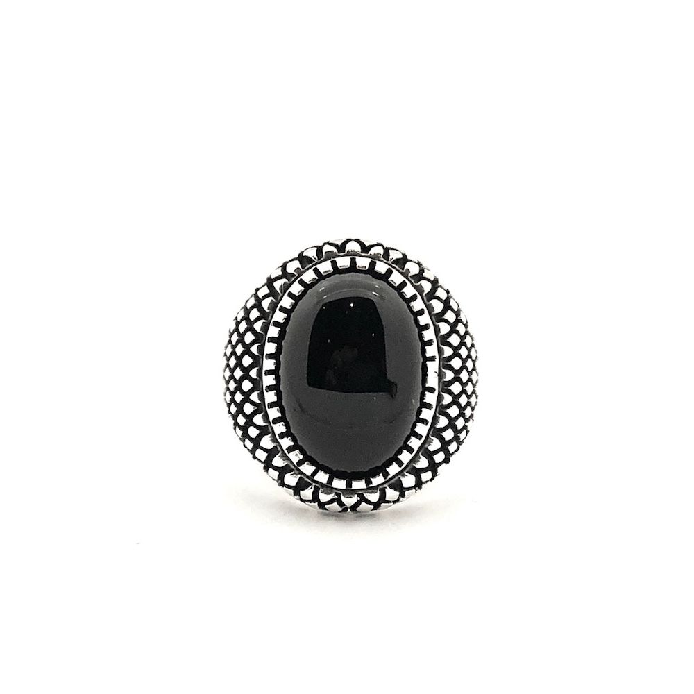 Silver bohemian signet ring with an oval cabochon-cut onyx stone. The ring is made of 925/1000 sterling silver.