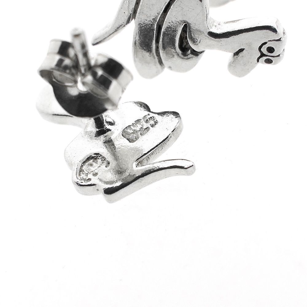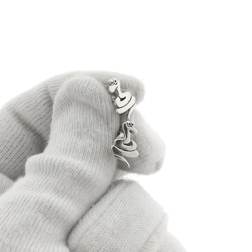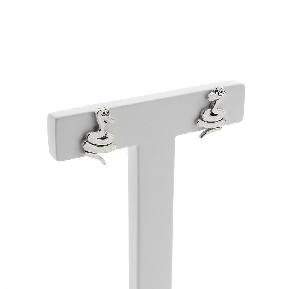 Set of silver snake stud earrings. The snakes have a friendly appearance. A lovely pair for the young animal lover. The stud earrings are made of 925/1000 sterling silver.