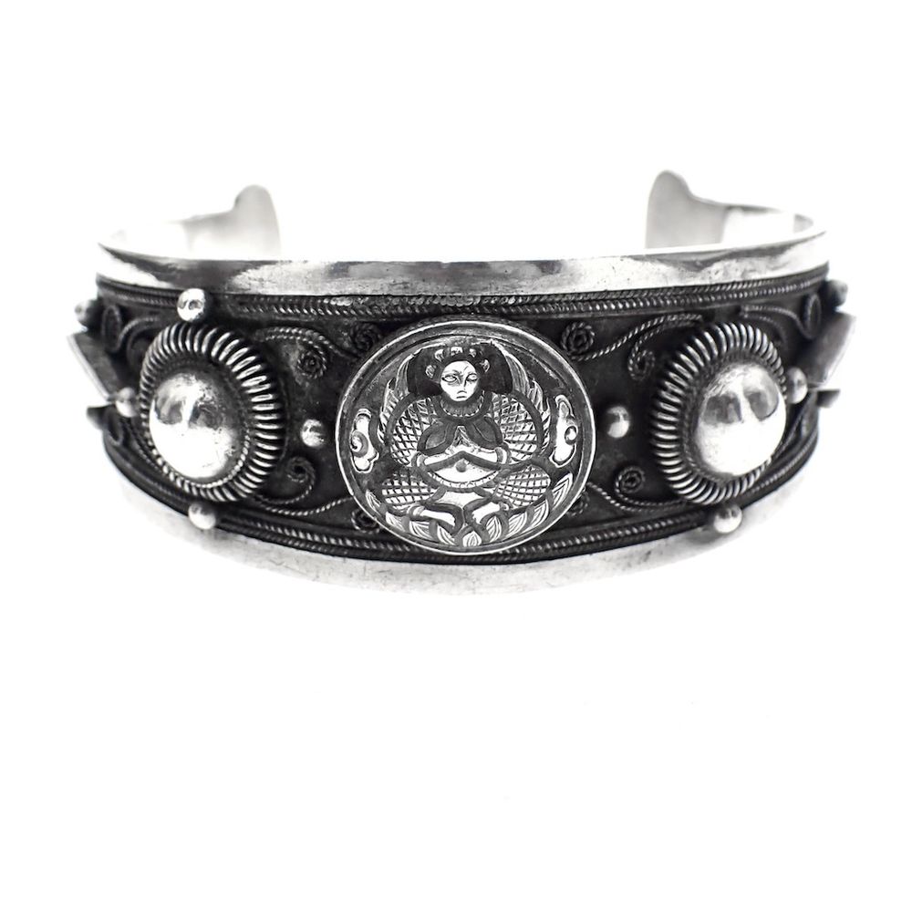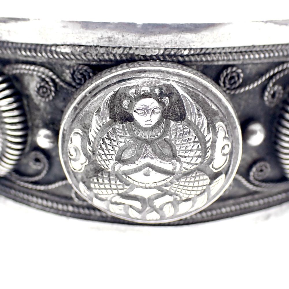 Silver Thai clamp bracelet. This bracelet features many different and unique details. A type of Asian god is depicted on the top of the bracelet. The bracelet is made of second-grade silver (835/1000).