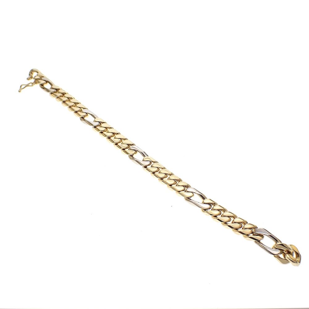 Two-tone gold Figaro link bracelet from the Turkish brand Erinç. The larger links are white gold, the rest are yellow gold. Fun fact: the name of the link is derived from the protagonist Figaro, from the Italian opera "Barber of Seville." This solid bracelet is crafted from 14-karat white and yellow gold (585/1000).