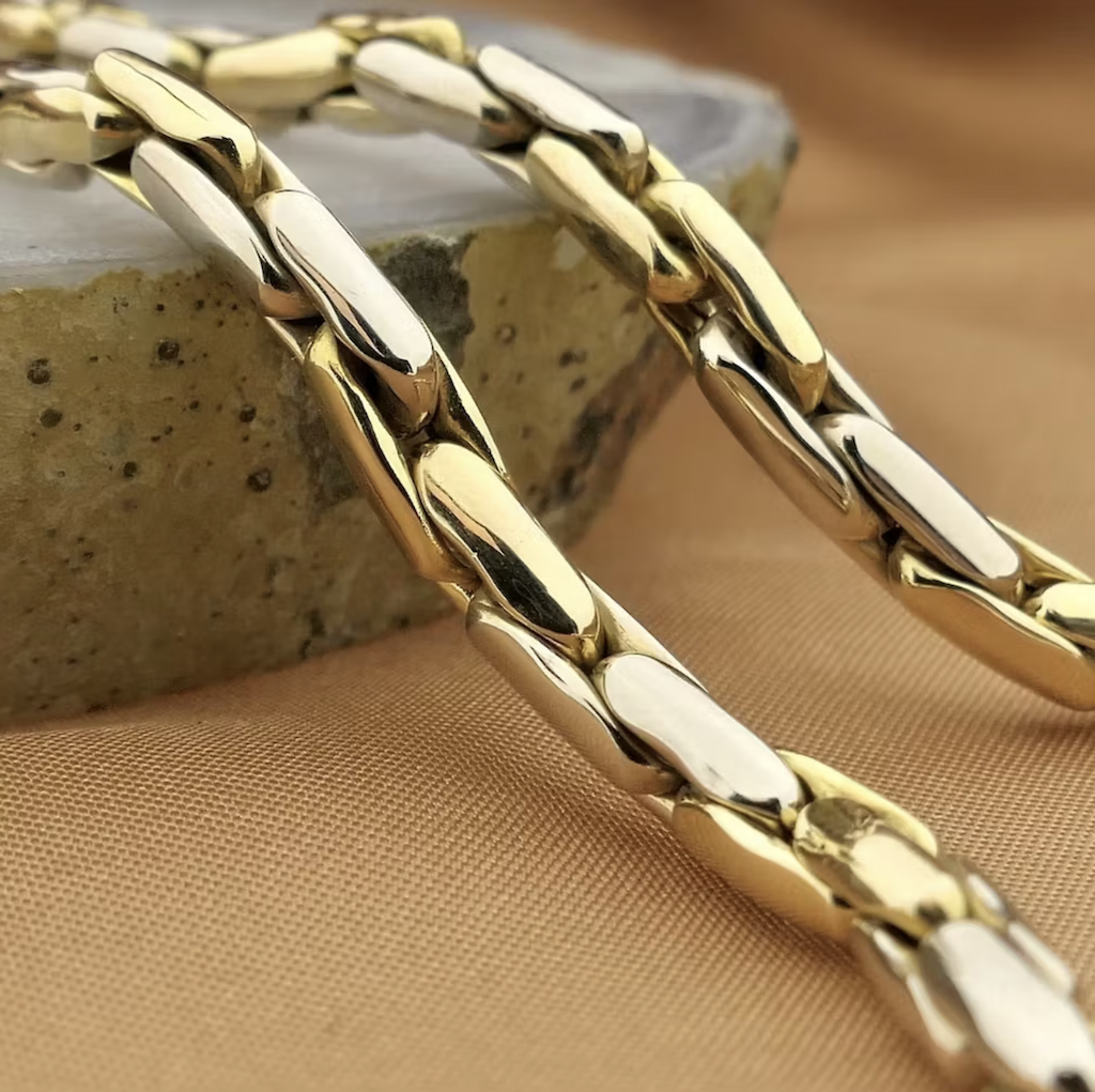 The cardan link is a type of link with a clear structure and a smooth drape. The links are interwoven in a way that creates a uniform pattern and a calm appearance. The result is a necklace or bracelet that is comfortable to wear and visually balanced.