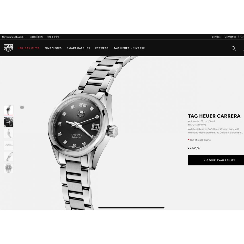 Sporty and elegant, do they go together? Yes, they do in this beautiful TAG Heuer Carrera WAR2413.BA0776 for women. It features diamond indices on the unique "Azurine" dial. You simply have to see the dial for yourself; what an eye-catcher! This is the latest Carrera model from the current exclusive collection. With a diameter of 28mm, it's an elegant and comfortable model. The current retail price is a whopping €4000, so this offer is a great start. This watch is brand new, unworn, and comes as a beautiful full set from 11-2024. Sporty, elegant, 100m water resistant, a high-quality Swiss Made automatic movement, diamond indices, and a beautiful dial. Need more reasons to put on this gem and enjoy it? It also features a beautifully finished, high-quality steel bracelet with a folding clasp that fits wrists of approximately 19.5cm. We can, of course, supply a custom-made bracelet if desired. This beautiful watch is brand new, delivered in 2024 with a significant discount and delivered as a full set as if it came straight from the store with TAG Heuer box, outer box, TAG Heuer warranty card, Diamond certification, booklets and accessories with a 1 year warranty (the TAG Heuer factory warranty is 2 - 5 years depending on activation).
