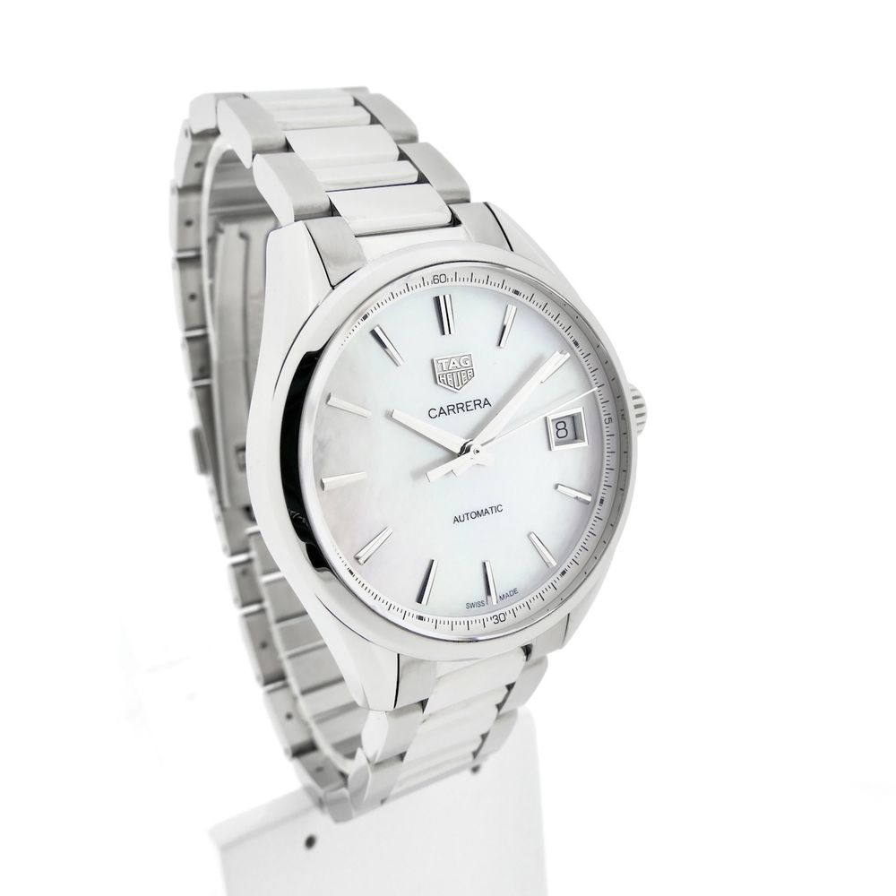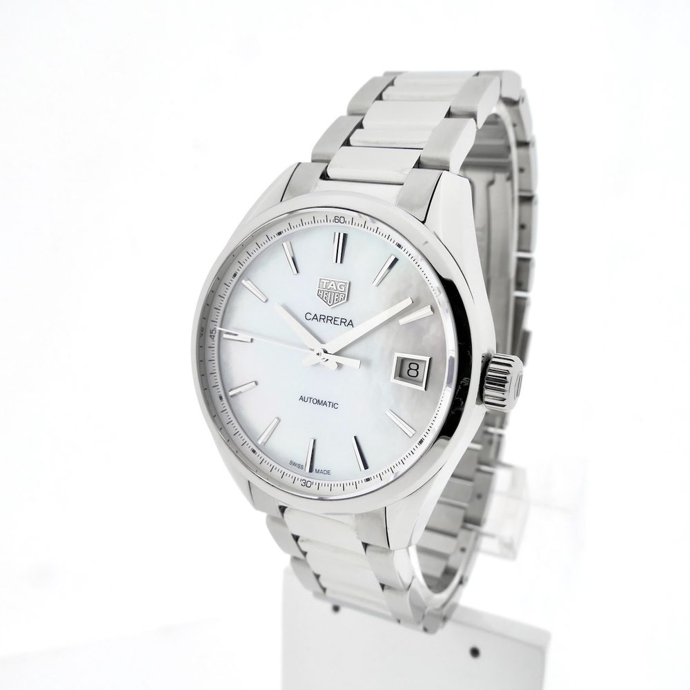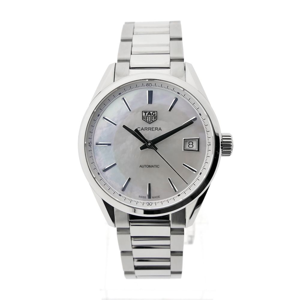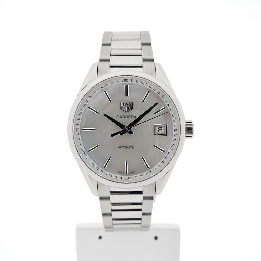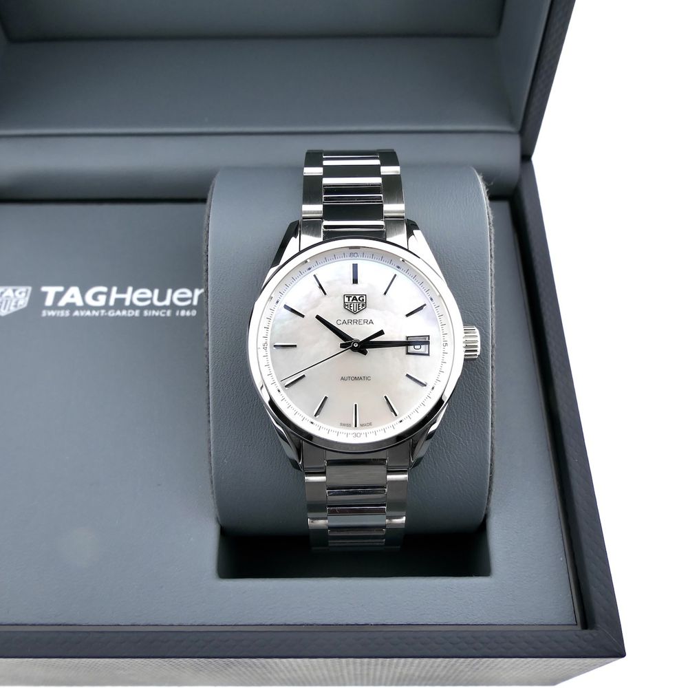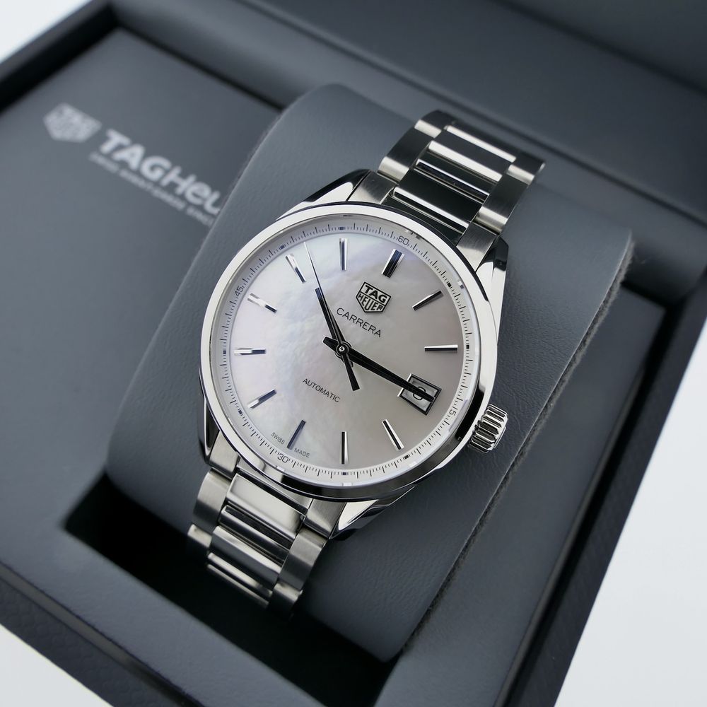 TAG Heuer Carrera, elegant, sporty, and popular! This TAG Heuer Carrera automatic with reference number WBK2311.BA0652 is striking thanks to its mother-of-pearl dial. The dial is truly eye-catching! Combined with the beautiful steel strap and folding clasp, this is a sporty and elegant watch from the Carrera collection. This is the latest Carrera model from the current collection. With a diameter of 36mm, it's a striking and distinctive model for women or suitable for narrow men's wrists. The retail price is a whopping €3500, so this offer is a great start. This watch is brand new, unworn, and comes as a beautiful full set from 11-2024. Sporty, elegant, 100m water resistant, high-quality Swiss Made automatic movement, and a beautiful mother-of-pearl dial. Need more reasons to wear this beautiful watch? This watch features a beautifully finished, high-quality leather strap with a folding clasp that fits wrists of up to approximately 19.5cm. This beautiful watch is brand new, delivered in 11-2024 With a big head cut off (or discount) and delivered as a full set as if it came straight from the store with TAG Heuer box, outer box, TAG Heuer warranty card, booklets and accessories with a 1 year warranty (the TAG Heuer factory warranty is 2 - 5 years depending on activation).