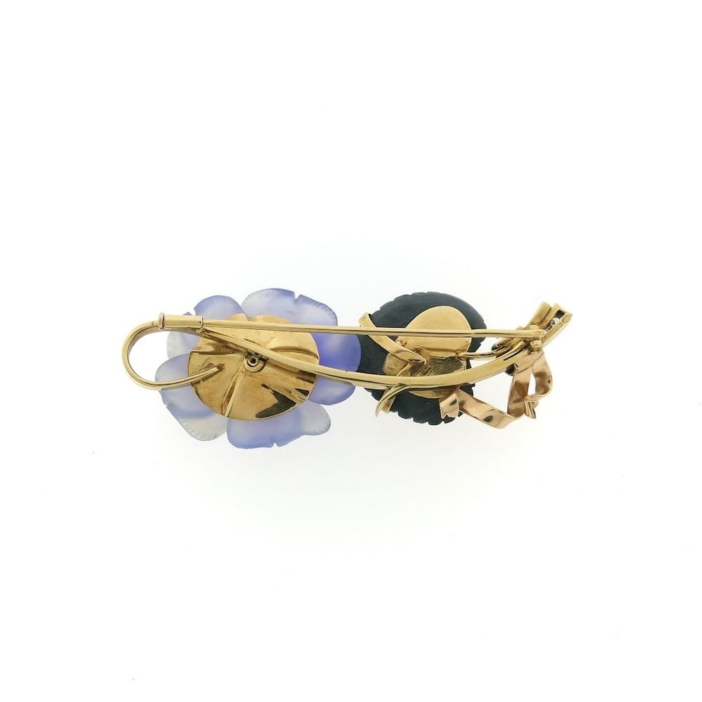 Tricolor gold brooch with colored glass, jade and diamond; 0.14 ct.