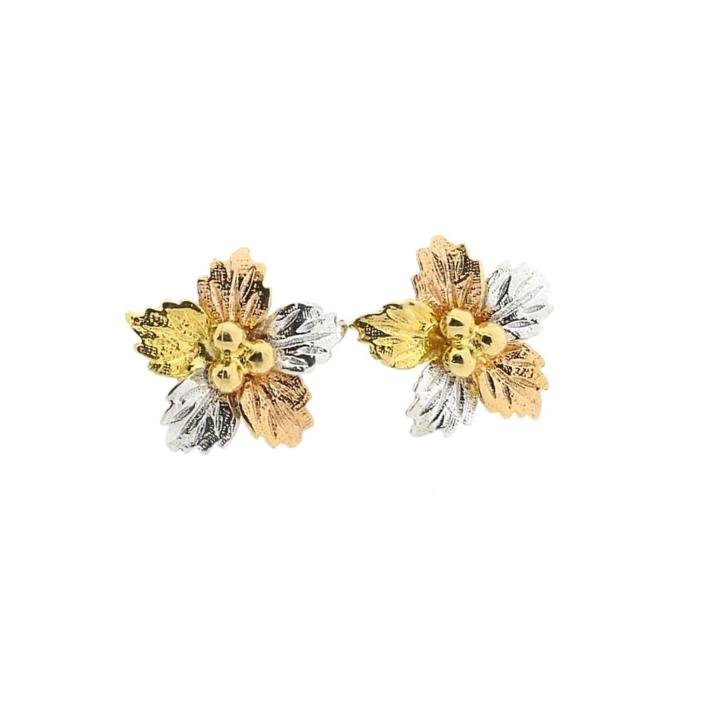 Tricolor gold stud earrings in the shape of a flower. The leaves are made of white, rose, and yellow gold and are beautifully detailed. Three yellow gold balls are set in the center. A stunning set of stud earrings crafted from 18-karat white, rose, and yellow gold (750/1000).