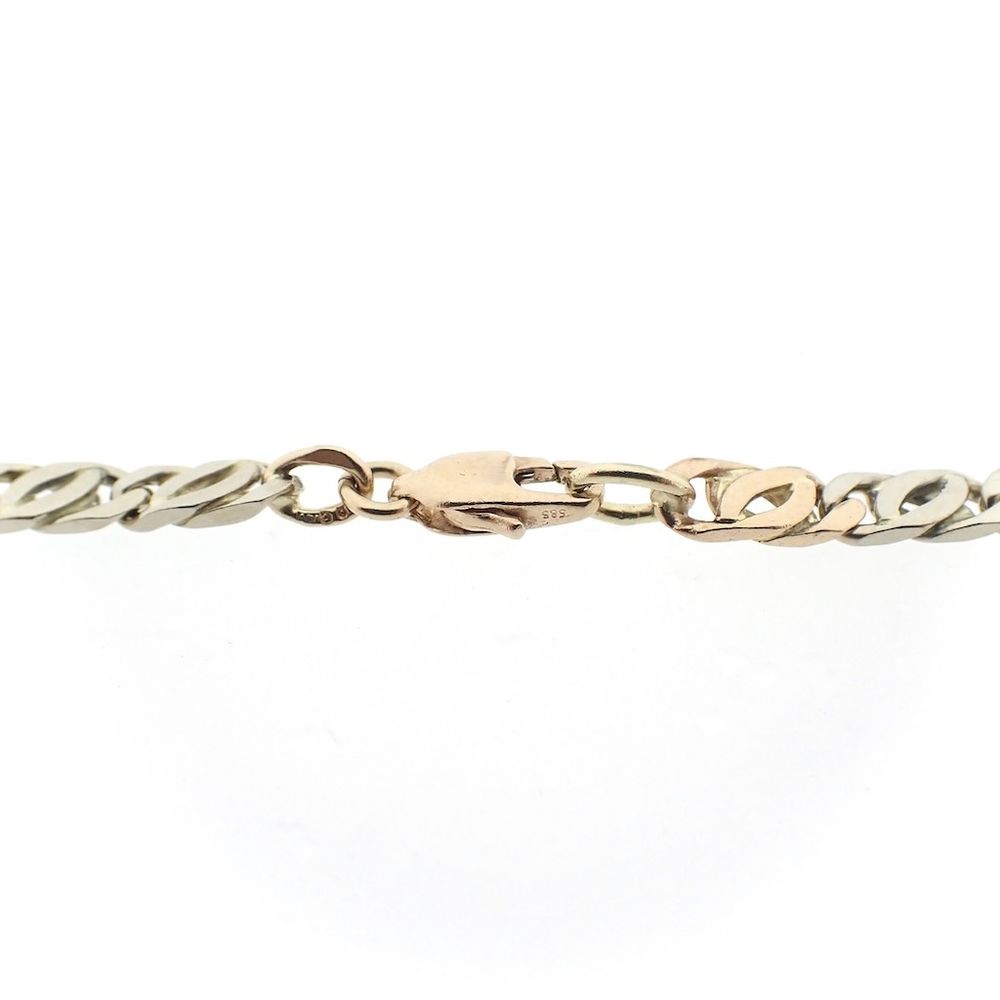 Tricolor gold link chain. The chain is made with flat gourmet links. The gold color changes every two links. This men's necklace is crafted from 14-karat yellow, white, and rose gold (585/1000).
