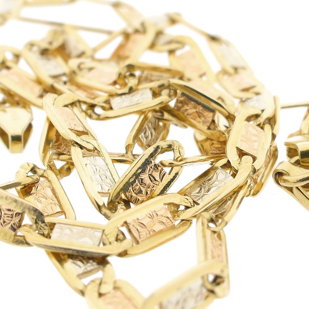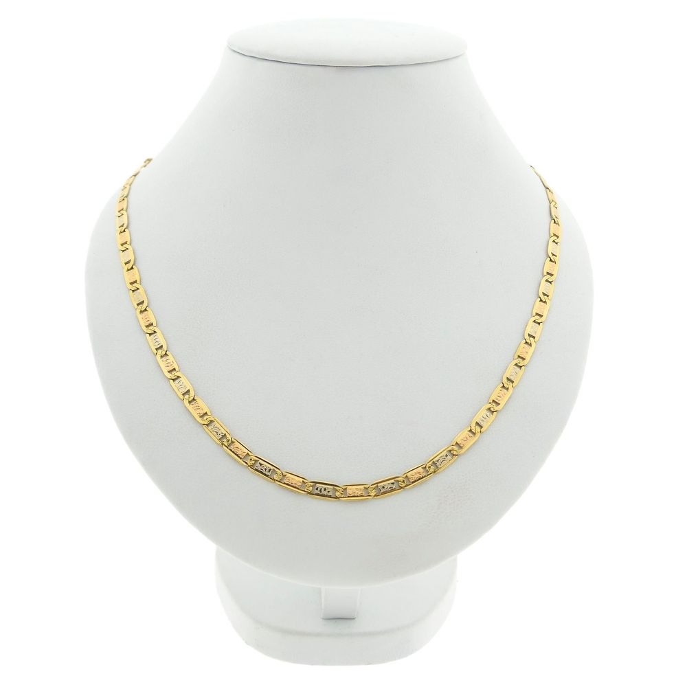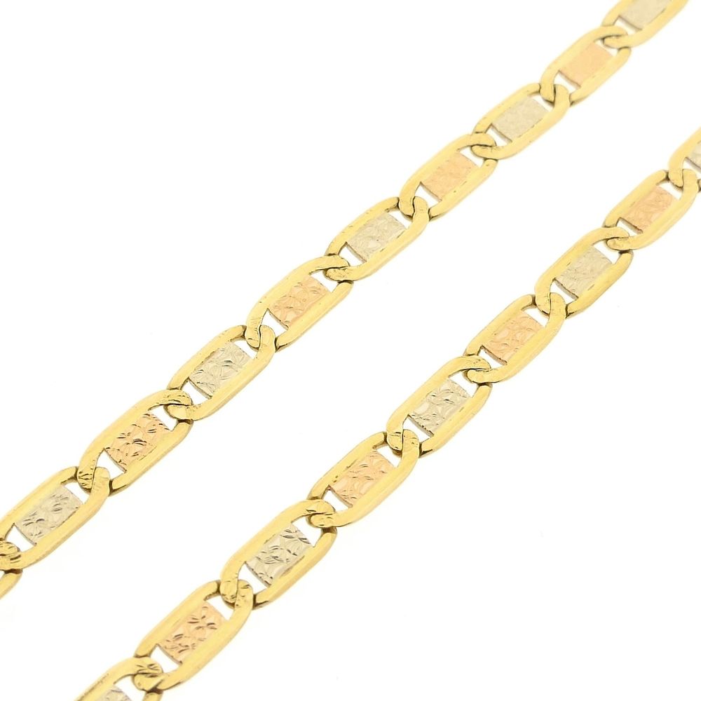 Tricolor gold navy link necklace. The chain's links are made of alternating white and rose gold. The piece is crafted from 18-karat yellow, white, and rose gold (750/1000).
