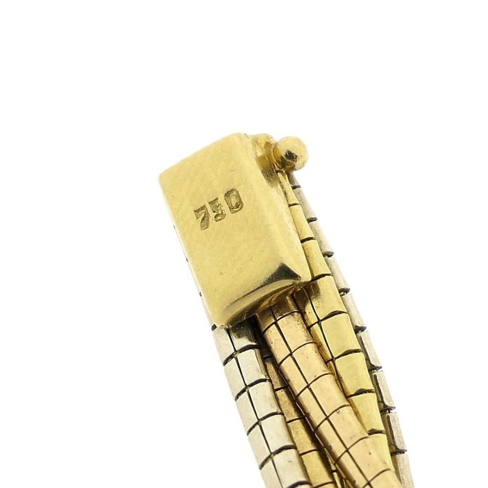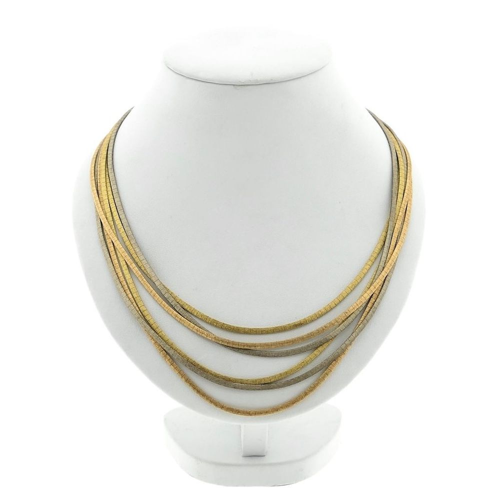 Tricolor gold necklace made with omega links. The link is 2.3 mm wide per strand, and 8.3 mm wide at the clasp. The necklace has a brushed finish and closes with a box clasp and safety hooks. A beautiful piece of jewelry with a luxurious and elegant appearance. The necklace is crafted from 18-karat yellow, white, and rose gold (750/1000).