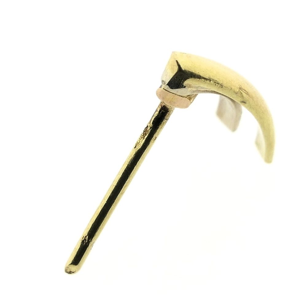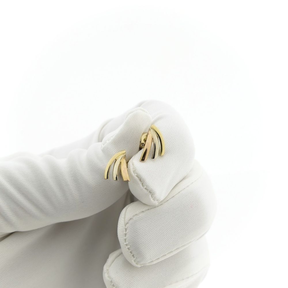 Tricolor gold stud earrings. These earrings have a sleek design and are slightly curved at the bottom. They are crafted from 14-karat yellow, white, and rose gold (585/1000).