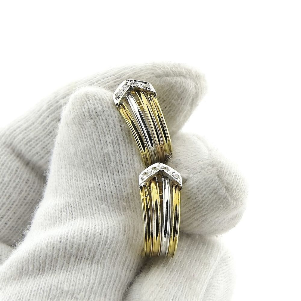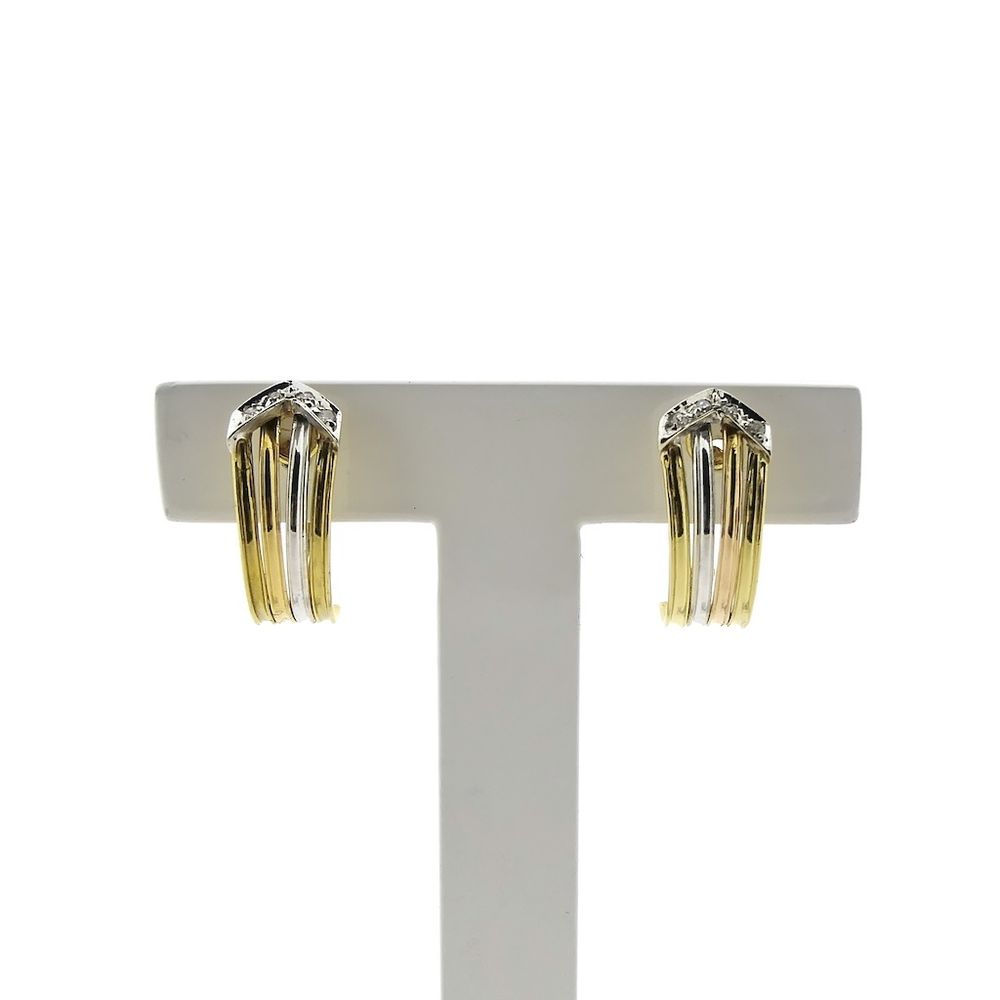 Tricolor gold earrings with diamonds. The earrings have a semi-circular design. A striking and elegant pair of earrings. The earrings close with a clip and are crafted from 14-karat white, rose, and yellow gold (585/1000).