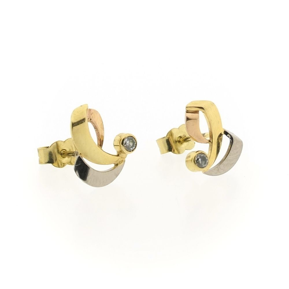 Tricolor gold stud earrings set with round brilliant-cut zirconia stones and featuring graceful curves. The earrings are crafted from 14-karat rose, white, and yellow gold (585/1000).
