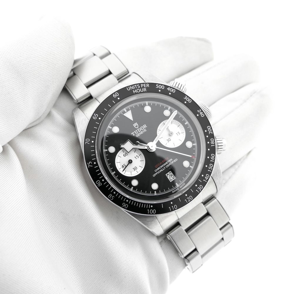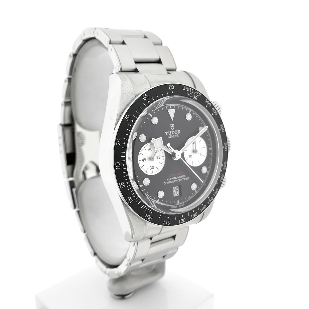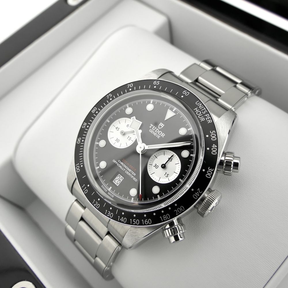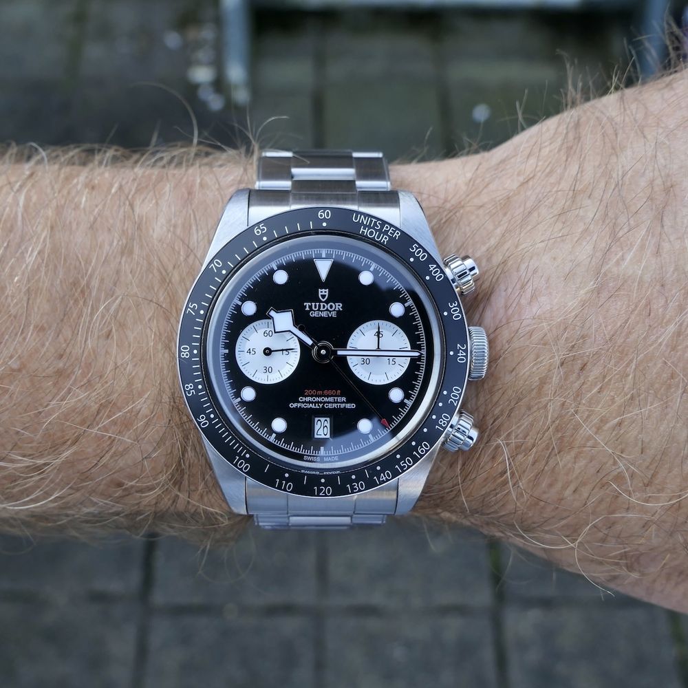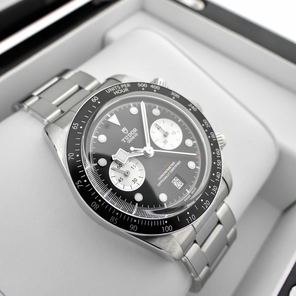 Tudor Black Bay Chronograph in 41mm. With a METAS-certified automatic movement and a 70-hour power reserve, this is top value for money, and of course, Tudor is Rolex's daughter brand. Delightfully understated yet strikingly beautiful. This isn't the "poor man's Daytona," but definitely the Daytona for smart people. Tudor is, of course, a wonderful brand that departs from Rolex's traditions a bit more, allowing you to walk around with confidence, and with a chronograph like this for a fraction of Rolex prices. It's no coincidence that the slogan is "Born to Dare," and we're convinced! This watch comes as a beautiful full set in excellent condition from 2021. Fortunately, this watch is equipped with all the modern technology and a brand-new Tudor MT5813 manufacture movement that runs perfectly and has a 70-hour power reserve. The movement runs perfectly and is very accurate. We measure an amplitude of 281 degrees and a deviation of max. 2 seconds per 24 hours. The chronograph features a high-quality column wheel mechanism and no fewer than 47 jewels to ensure perfect movement. This watch comes on the original steel Tudor bracelet. All links are included, suitable for wrists up to approximately 20cm. The beautifully finished steel bracelet brings the watch into perfect balance and is the perfect choice for this watch. It comes as a beautiful full set, including the original box, Tudor booklet, extra link, and Tudor warranty card. You'll also receive our warranty report and a 1-year warranty. Tudor... Who dares?