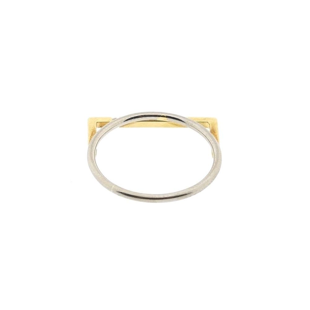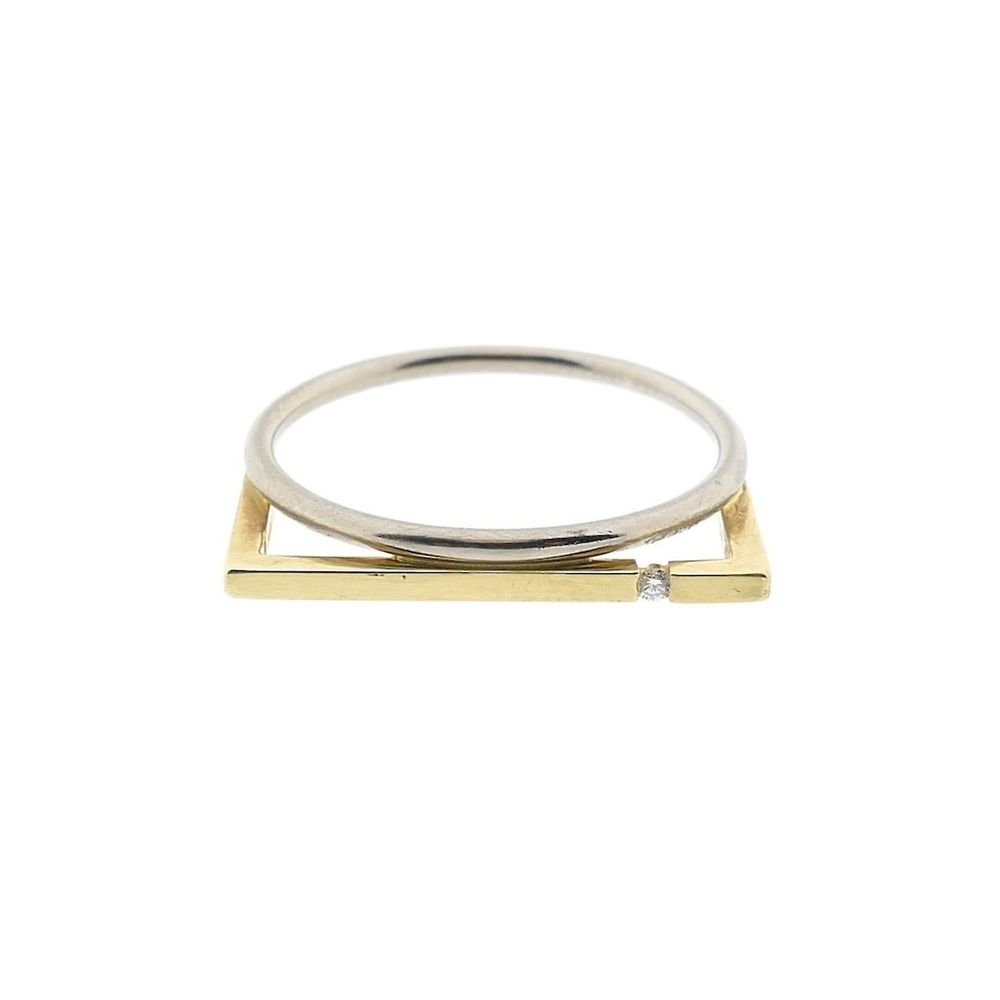 Two-tone gold ring with an abstract design and diamond. The ring consists of a white gold ring with a square yellow gold section. The natural round brilliant-cut diamond is set in the yellow gold section, weighing a total of 0.015 ct. The ring is crafted from 14-karat white and yellow gold (585/1000).