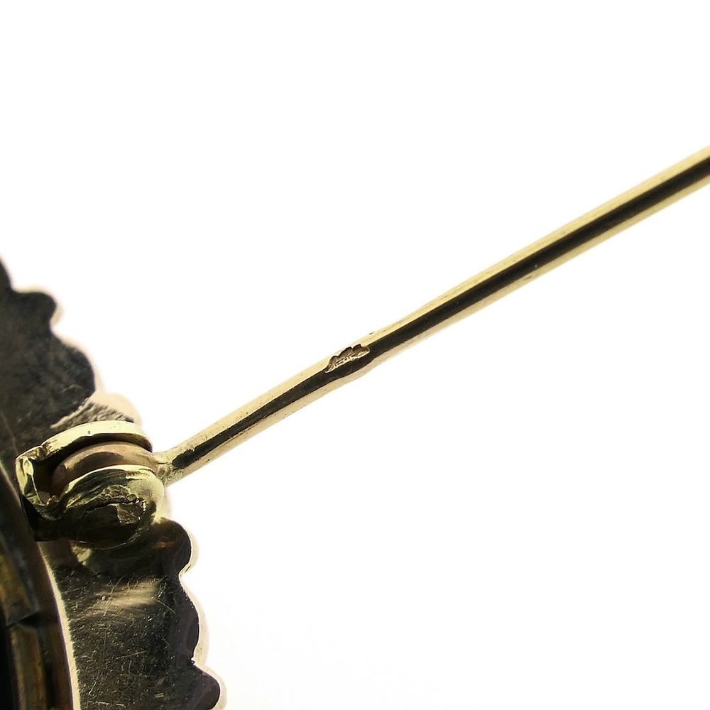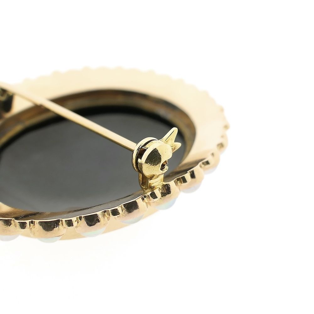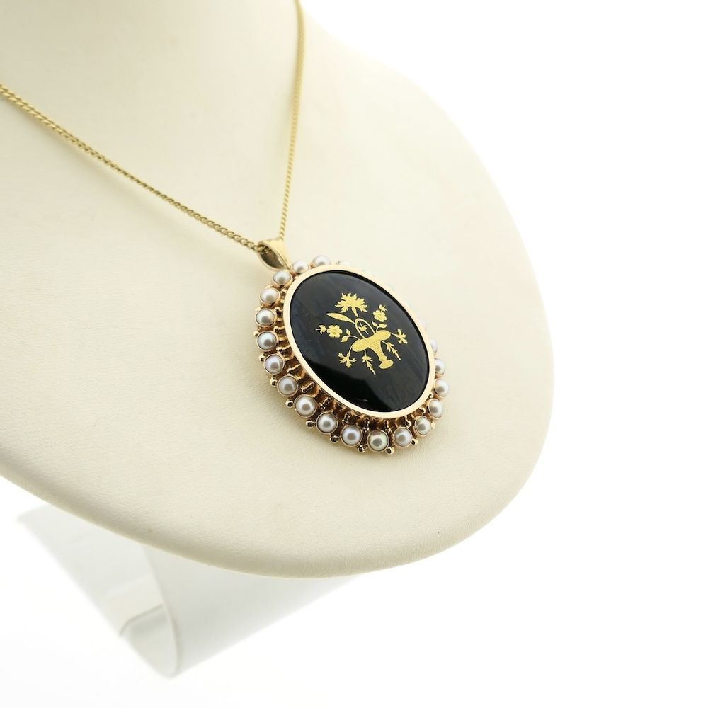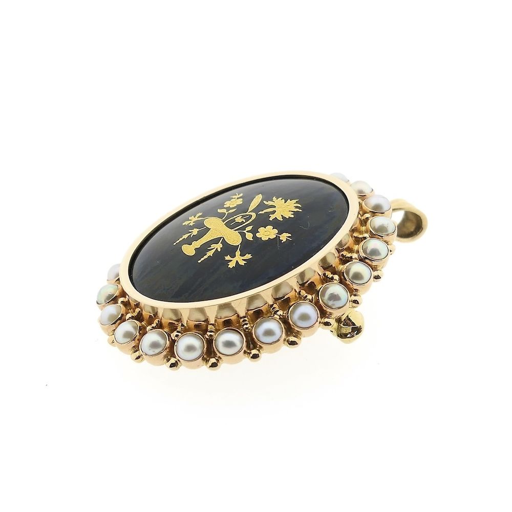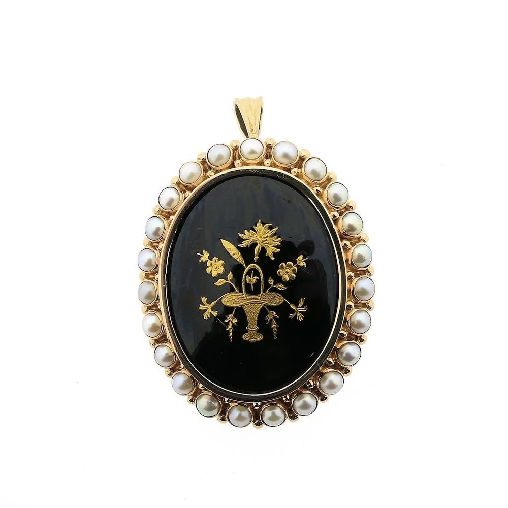 Antique two-tone gold brooch/pendant detailed with black enamel. The painting has a floral look and is crafted in yellow gold. The frame is elegant, and the edge is set with cultured pearls. The piece is crafted from 14-karat yellow and rose gold (585/1000).