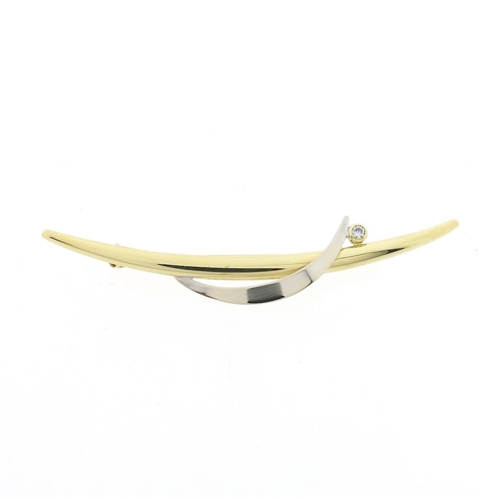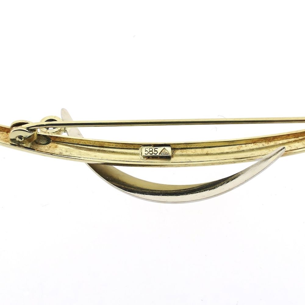 Two-tone gold fantasy brooch set with a round brilliant-cut zirconia stone. The brooch has a dynamic design and is crafted from 14-karat white and yellow gold (585/1000).