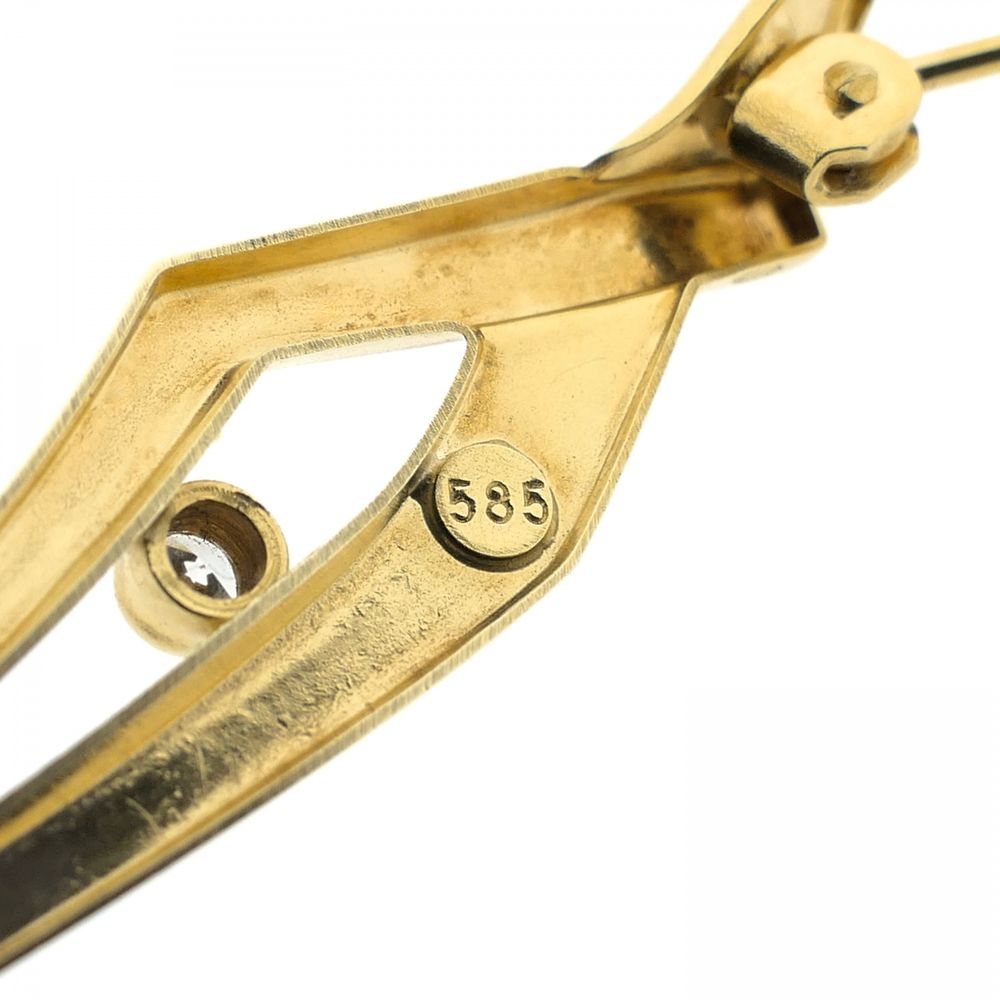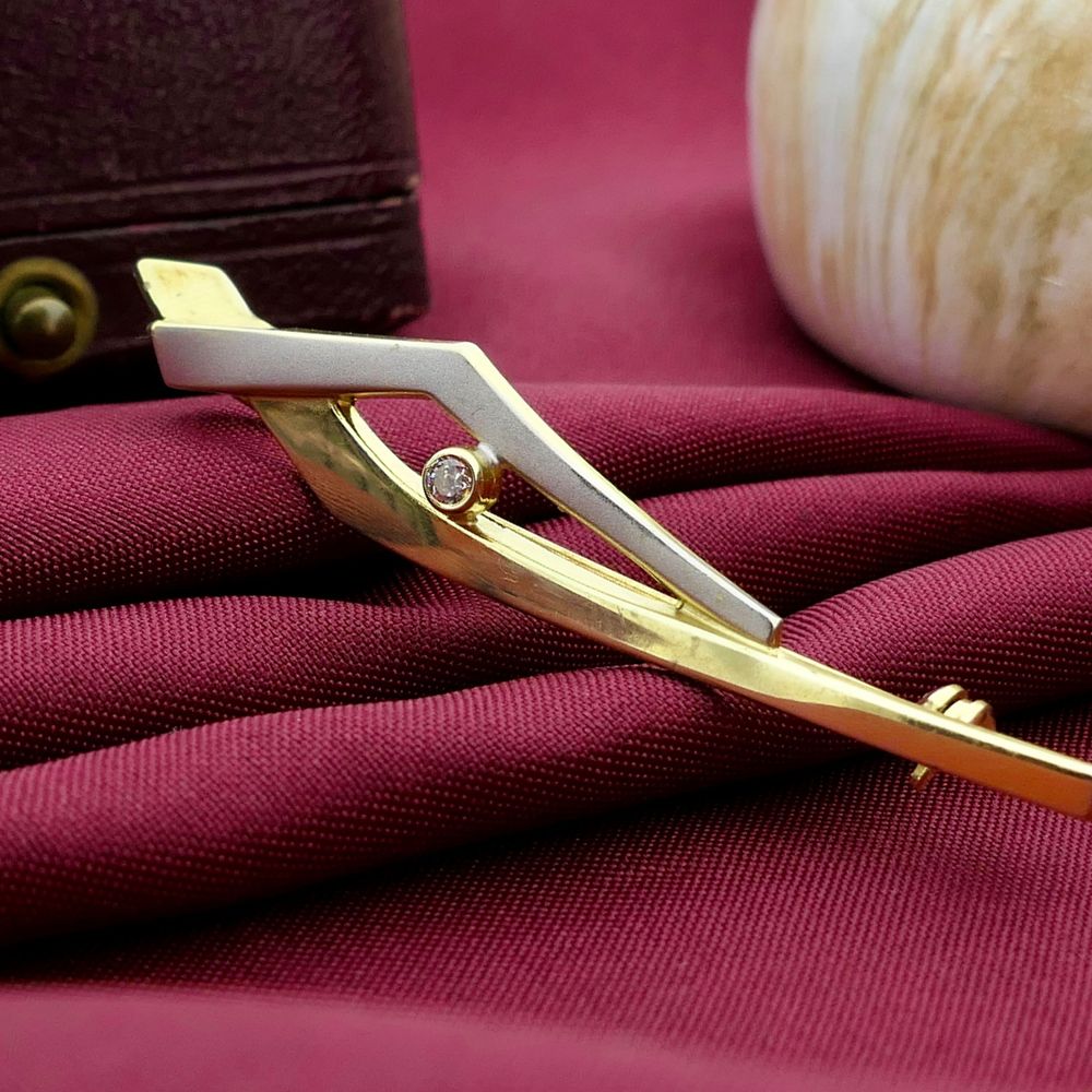 Two-tone gold brooch with dynamic lines and a brilliant-cut zirconia stone. This beautiful accessory is crafted from 14-karat white and yellow gold (585/1000).