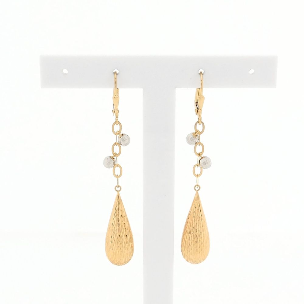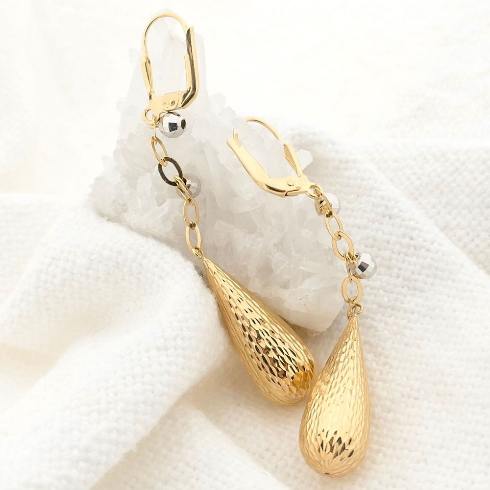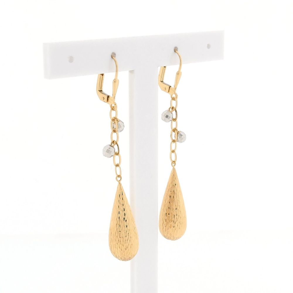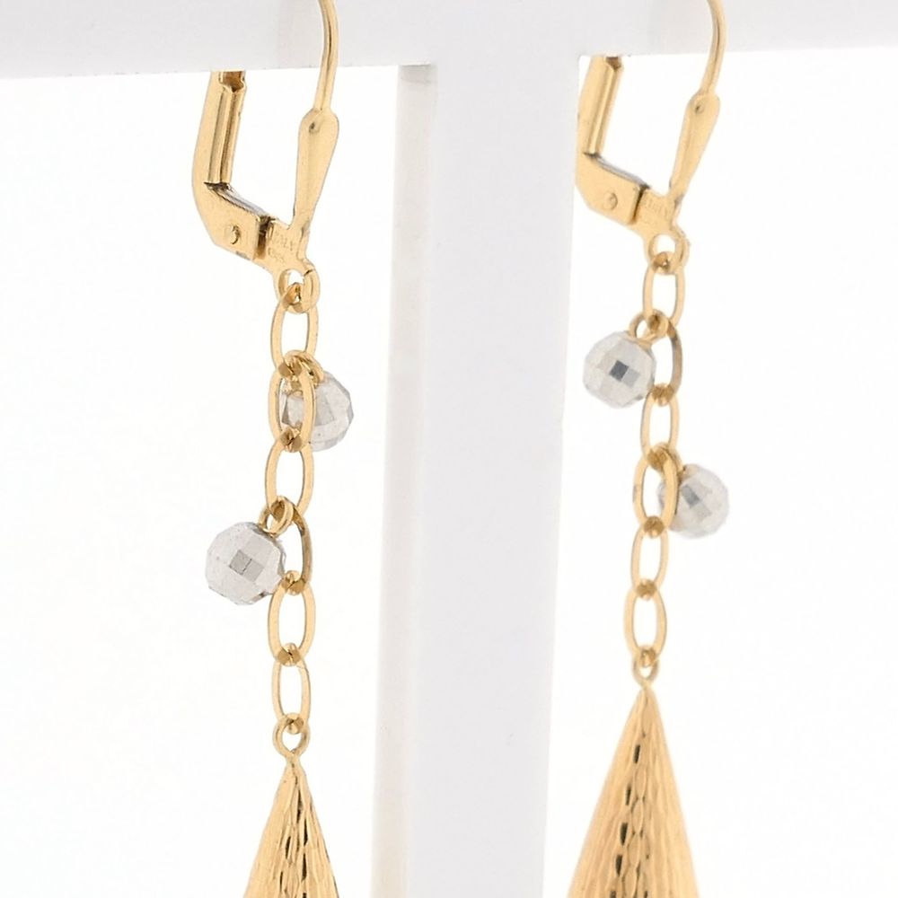 Two-tone gold earrings with a detailed finish. The design features two small disco balls hanging at the top. The earrings are crafted from 14-karat yellow gold (585/1000).