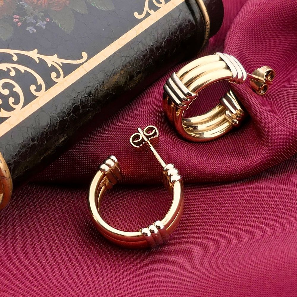 Two-tone gold stud earrings. The earrings consist of three rings, held together by white gold pieces. The studs are crafted from 14-karat white and yellow gold (585/1000).