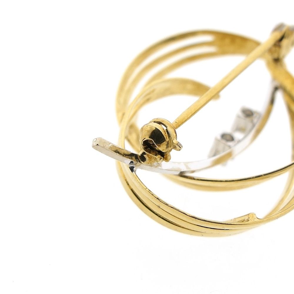 Two-tone gold fantasy brooch with natural diamonds. The brooch features beautiful, dynamic lines. In the center are two round, brilliant-cut diamonds set in a high, four-pronged white gold chaton with a total weight of 0.02 ct. The brooch is crafted from 14-karat white and yellow gold (585/1000).