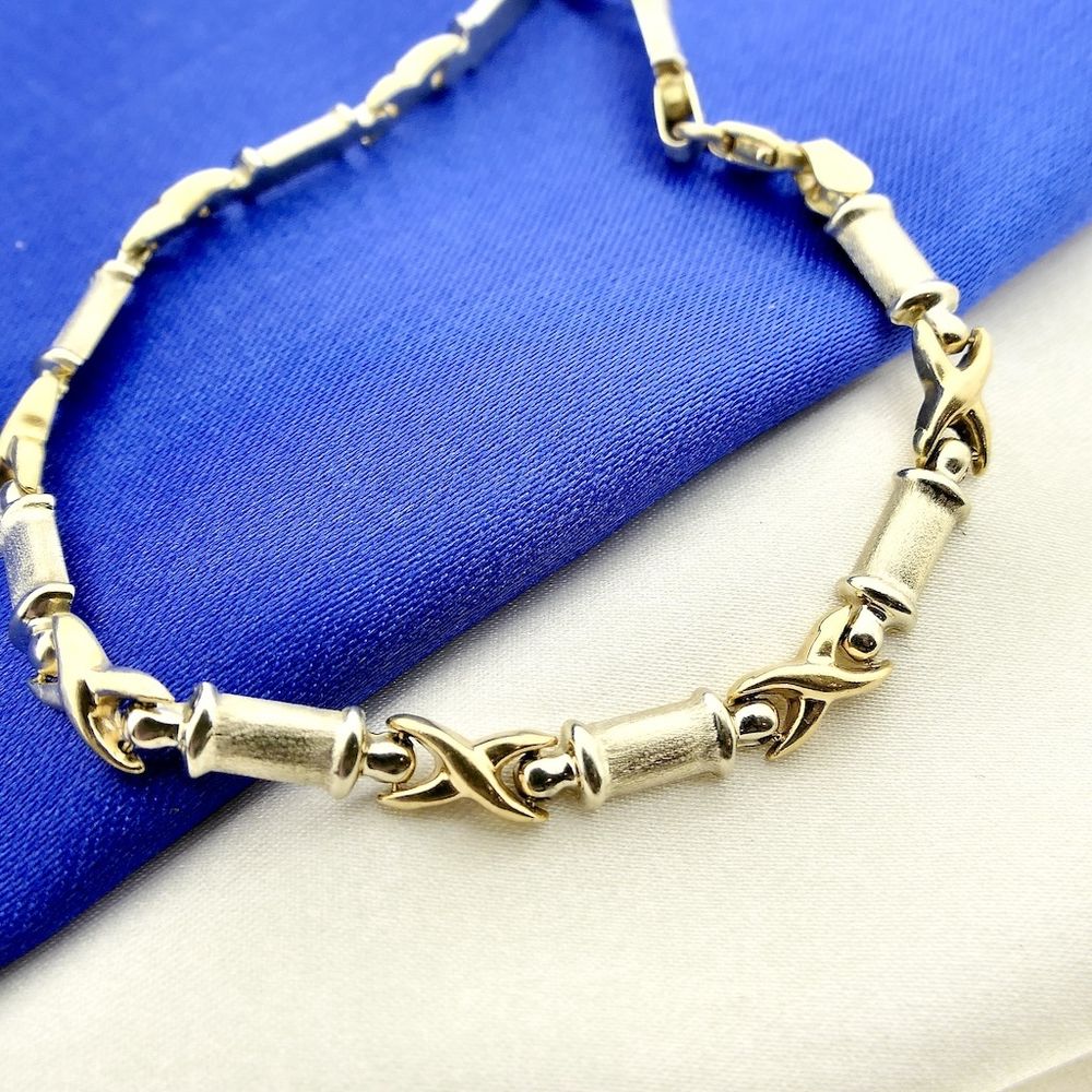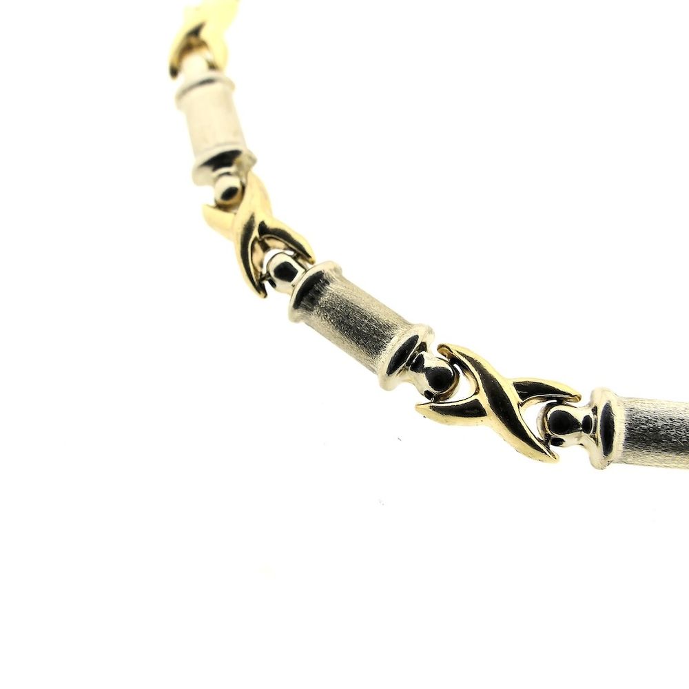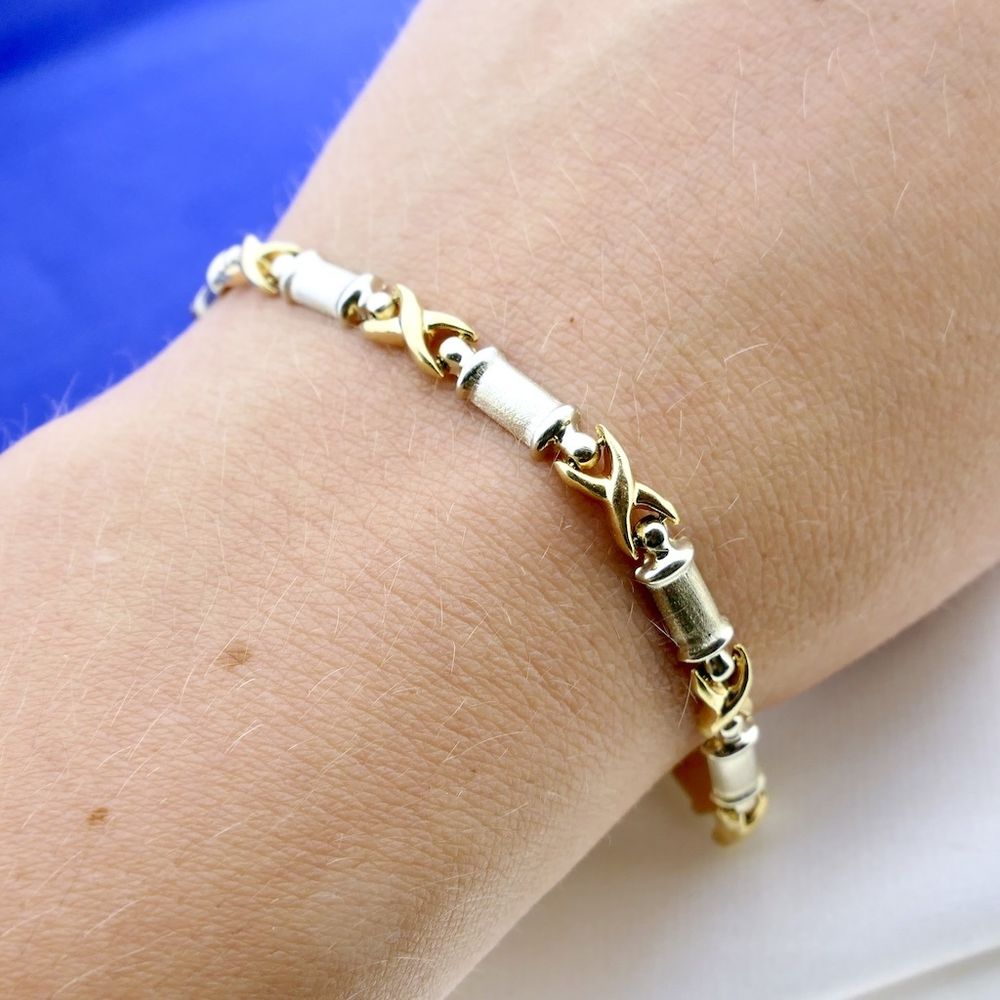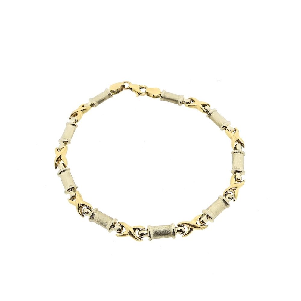 Two-tone gold fantasy link bracelet. This bracelet has a unique and luxurious look. The links are hollow. This women's bracelet is crafted from 14-karat white and yellow gold (585/1000).