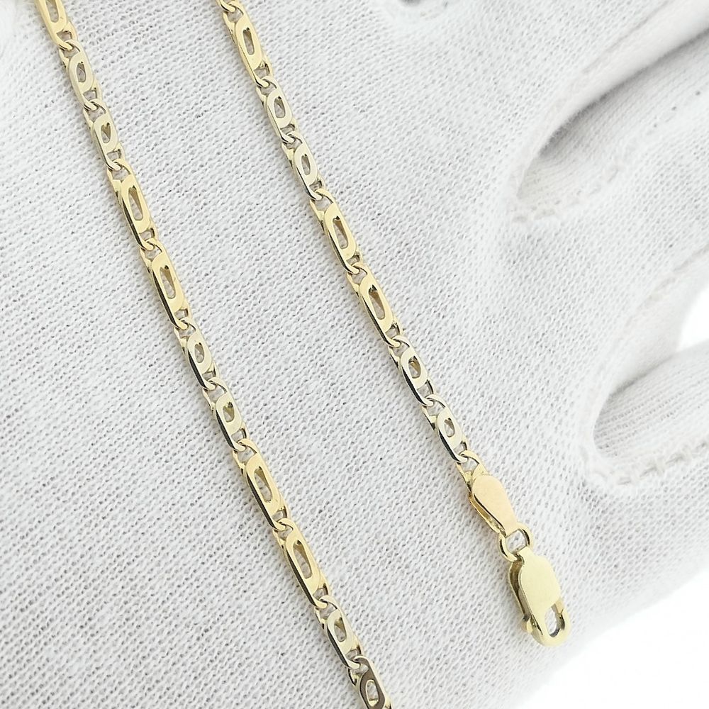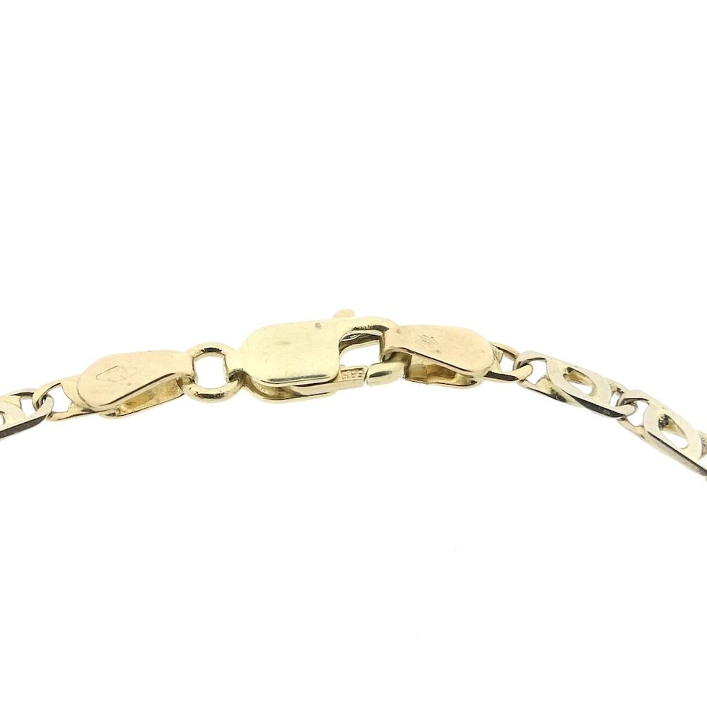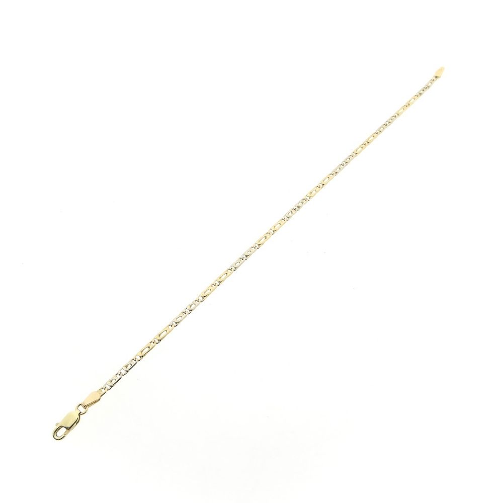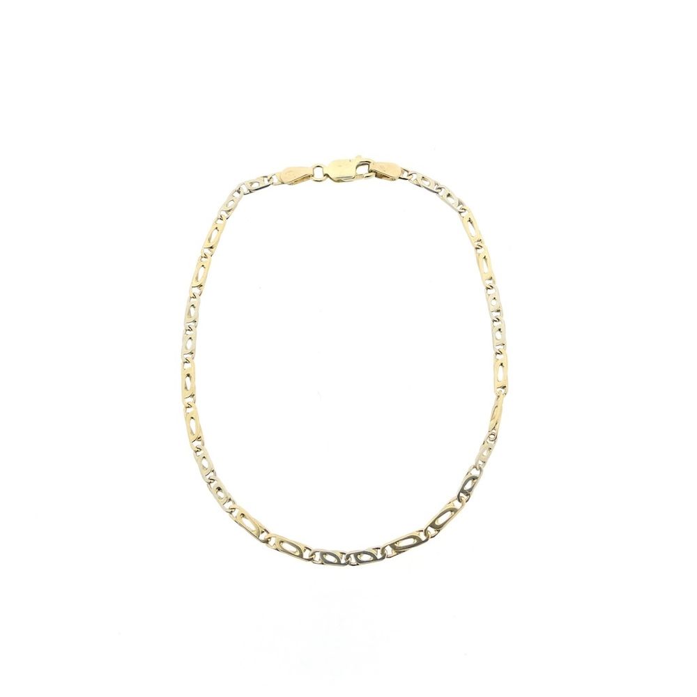 Two-tone gold bracelet with decorative links. Every two yellow gold links are interlaced with two white gold links. The bracelet has a polished finish and is crafted from 14-karat white and yellow gold (585/1000).