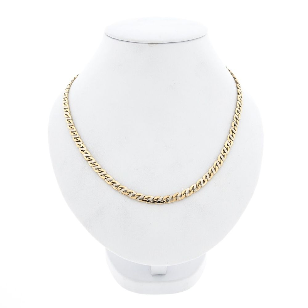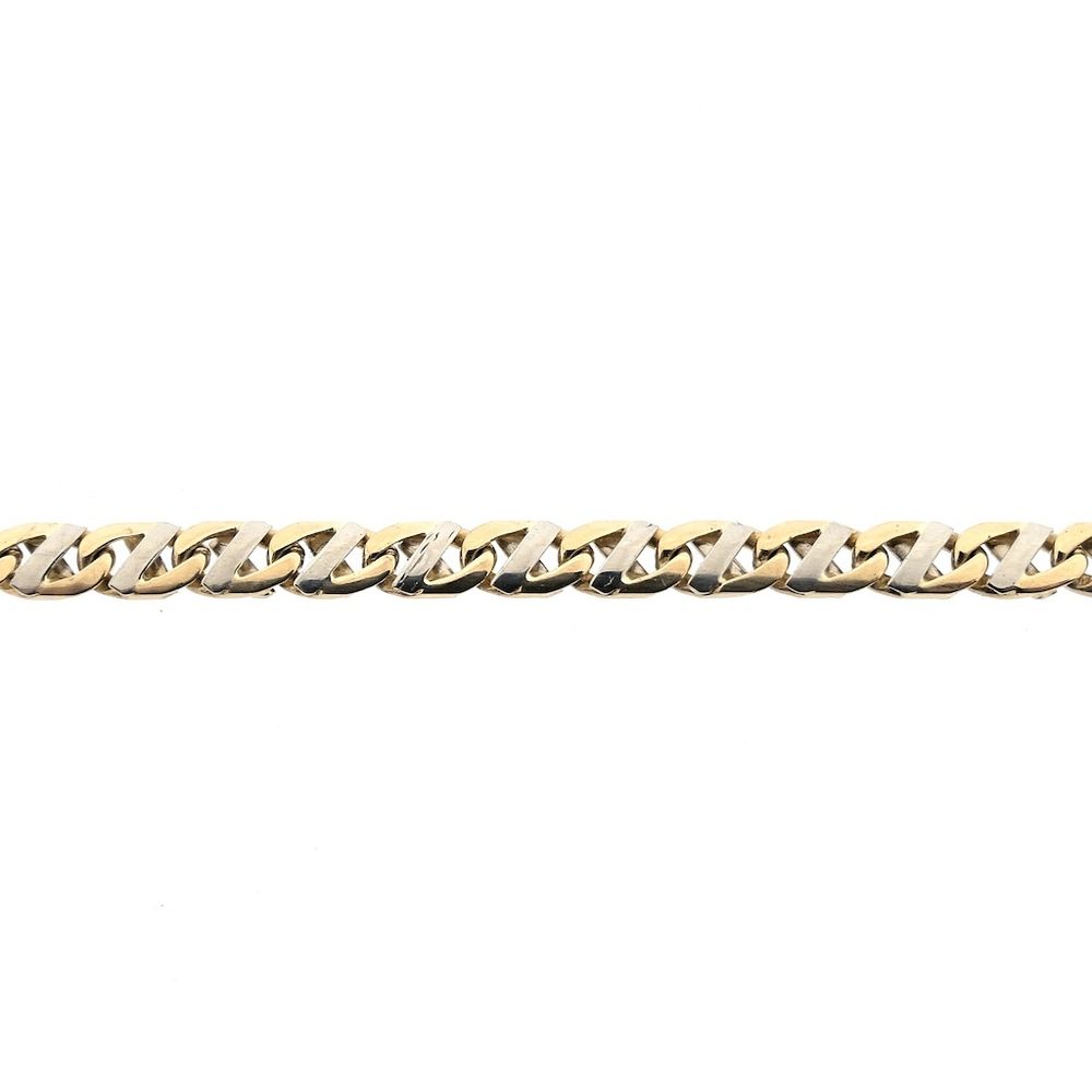 Two-tone gold fantasy link chain. Each link is finished with a section of white gold. The links are 4.5 mm wide. The piece closes with a lobster clasp and is crafted from 14-karat white and yellow gold (585/1000).