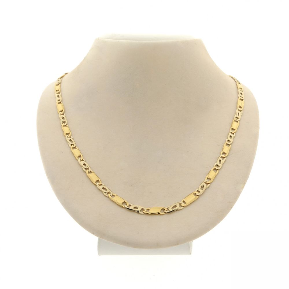 Two-tone gold fantasy link necklace. The links are alternating white and yellow gold, with a link width of 4.4 mm. The necklace closes with a lobster clasp and is crafted from 18-karat white and yellow gold (750/1000).