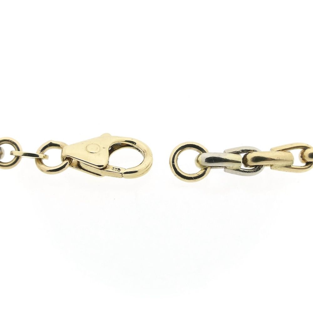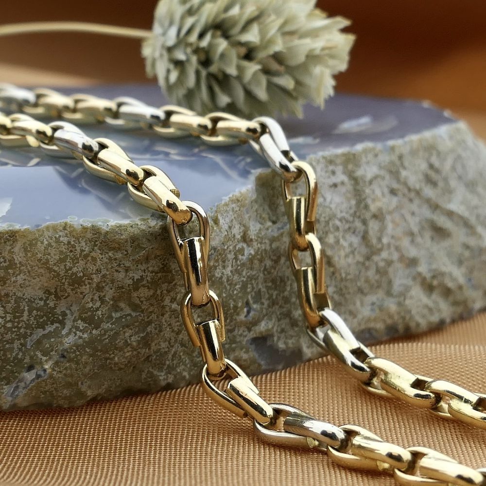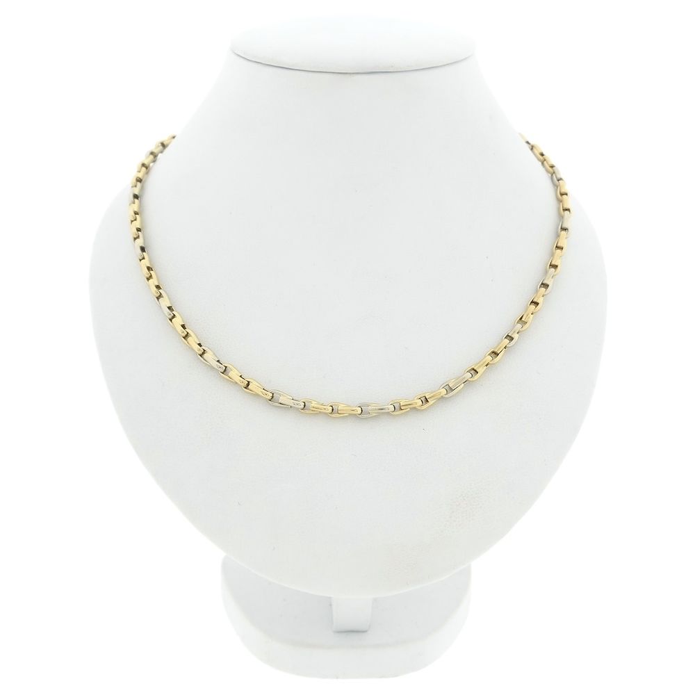 Two-tone gold necklace made with decorative links. Every two yellow gold links are followed by a white gold link. The links are openwork and have a polished finish. The necklace is crafted from 14-karat white and yellow gold (585/1000).