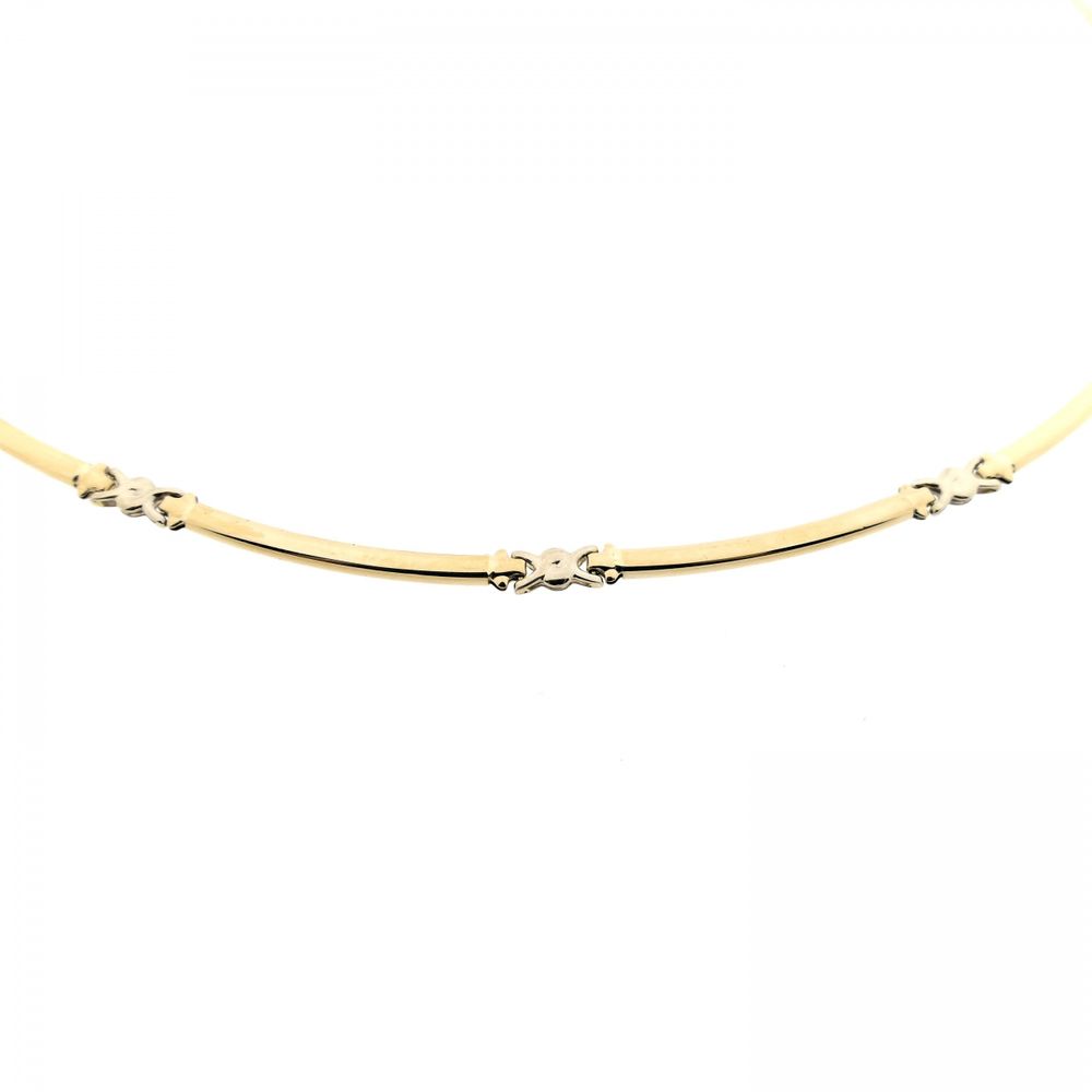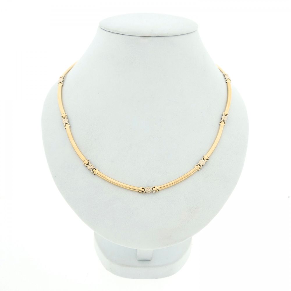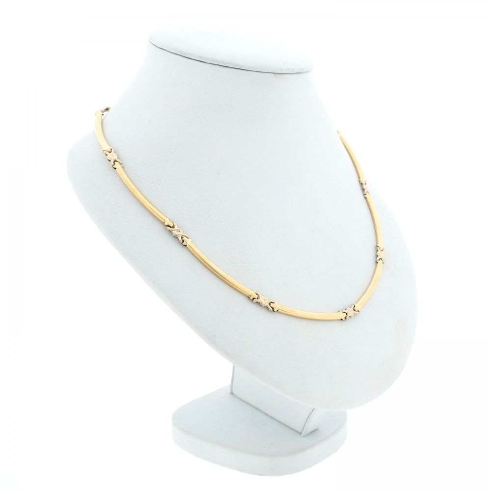 Two-tone gold necklace made with fancy links. A white gold link is added after each long yellow gold link. The necklace is crafted from 14-karat white and yellow gold (585/1000).