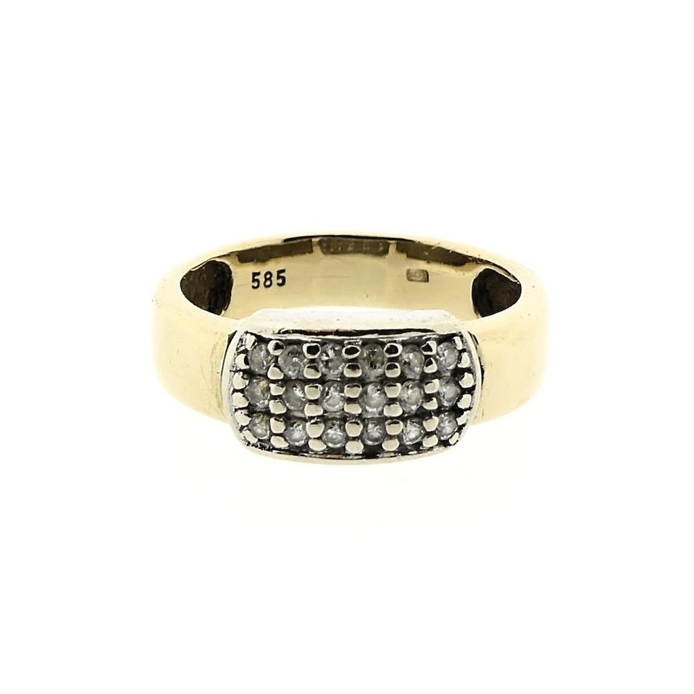 Two-tone gold ring pavé-set with round brilliant-cut zirconia stones. The ring is crafted from 14-karat white and yellow gold (585/1000).