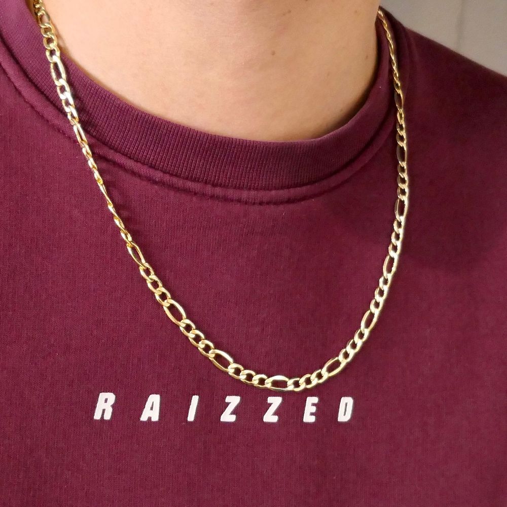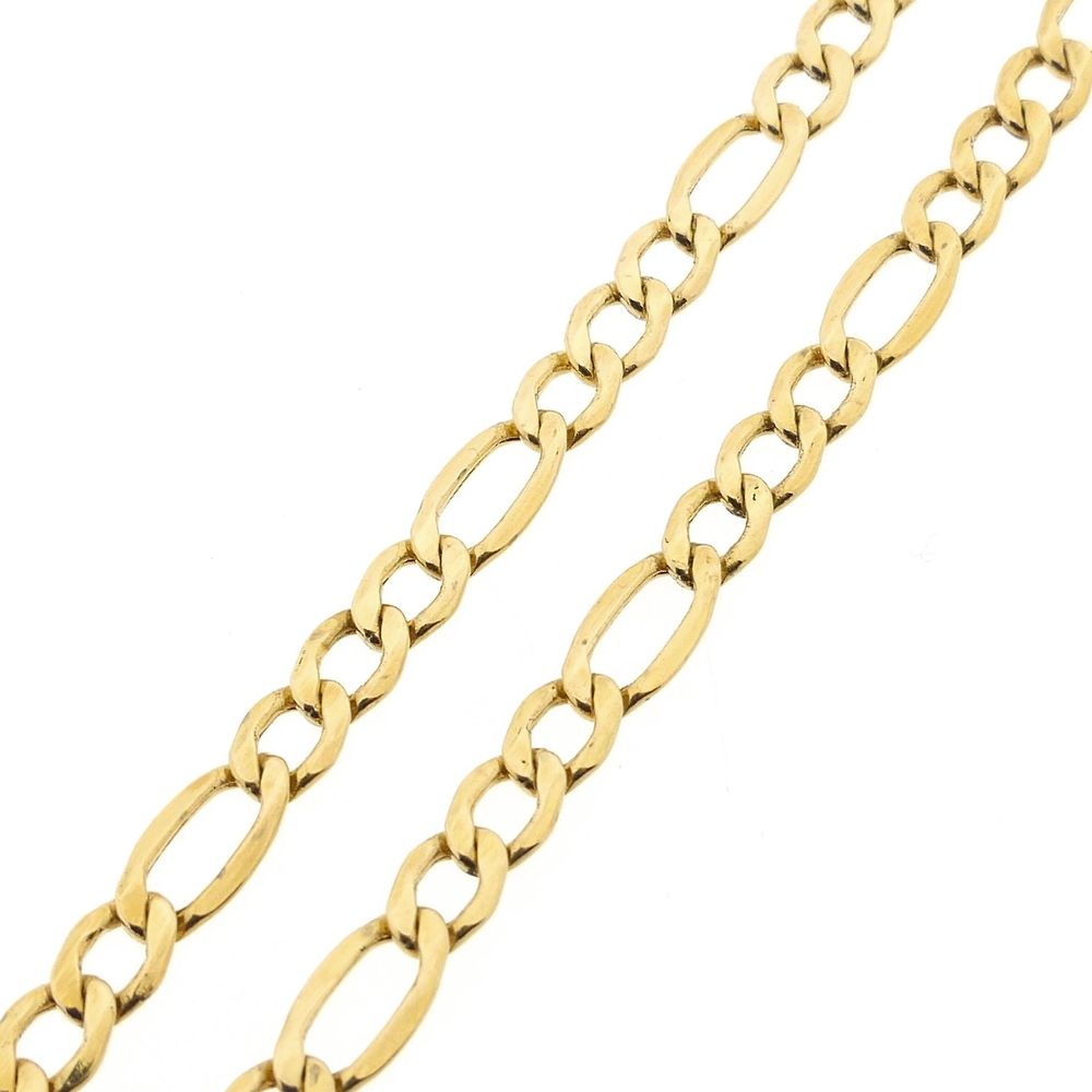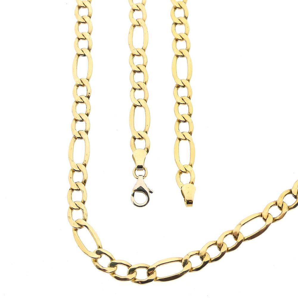 Two-tone gold Figaro link necklace. These classic links are 5.7 mm wide. The lobster clasp is crafted from white gold. Fun fact: The name comes from the protagonist, Figaro, from the Italian opera "Barber of Seville." A timeless necklace crafted from 14-karat white and yellow gold (585/1000).
