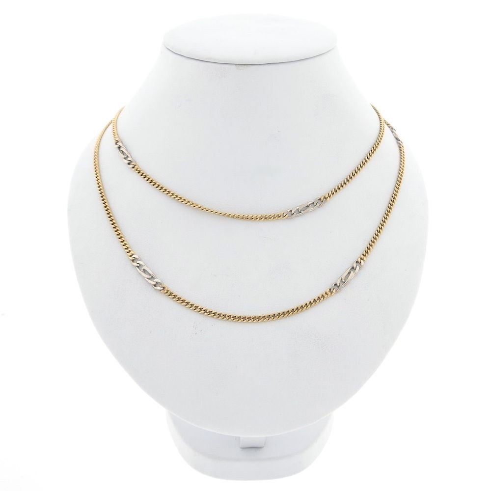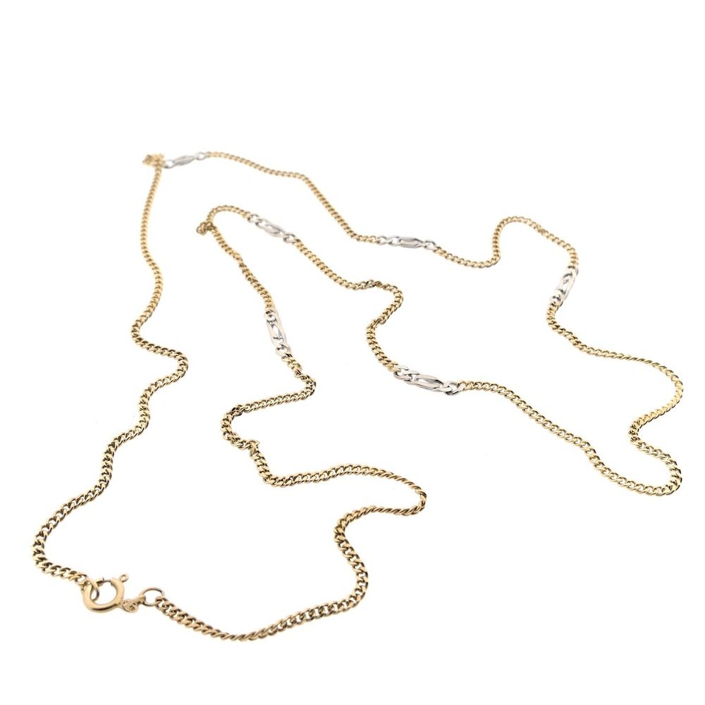 Two-tone gold curb/fancy link chain. This link is a unique variation on the classic curb link, with a white gold link placed between each pair. The links are 3.7 mm wide. The piece closes with a spring ring and is crafted from 14-karat white and yellow gold (585/1000).