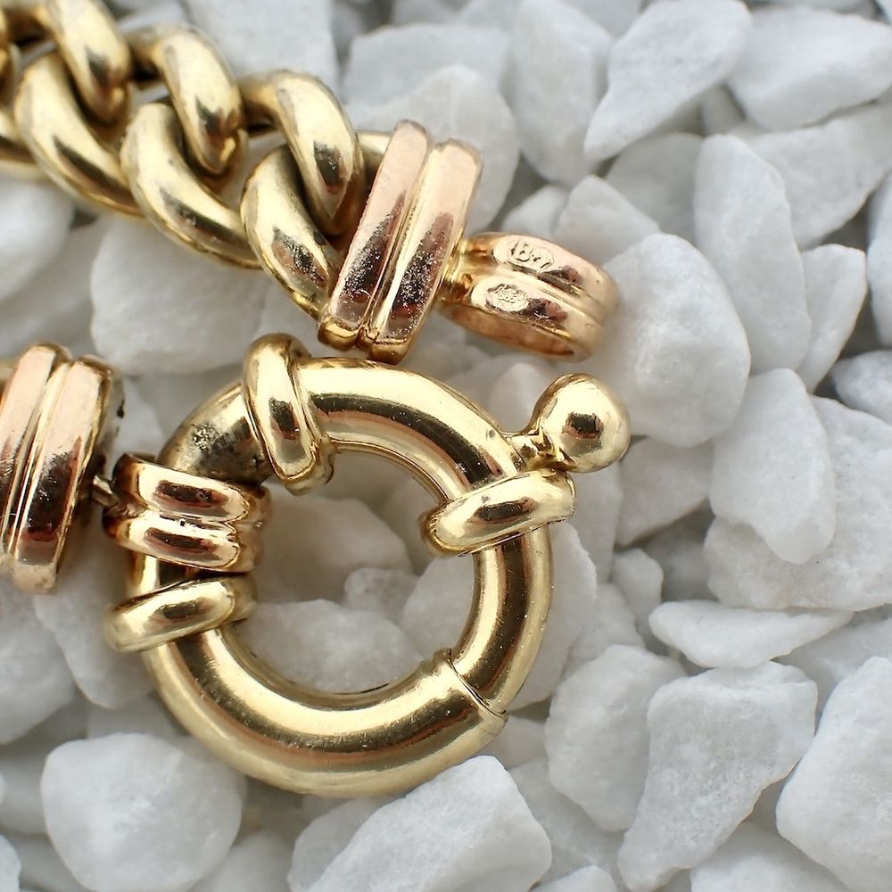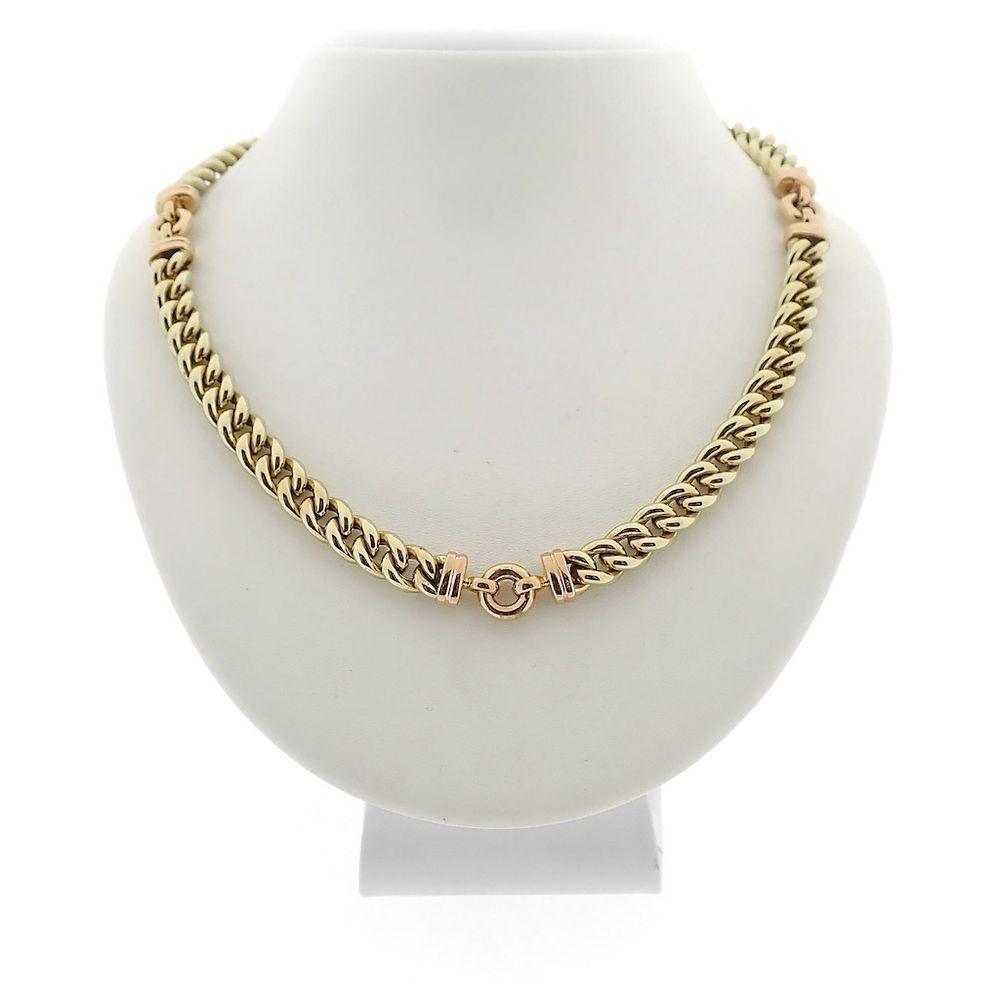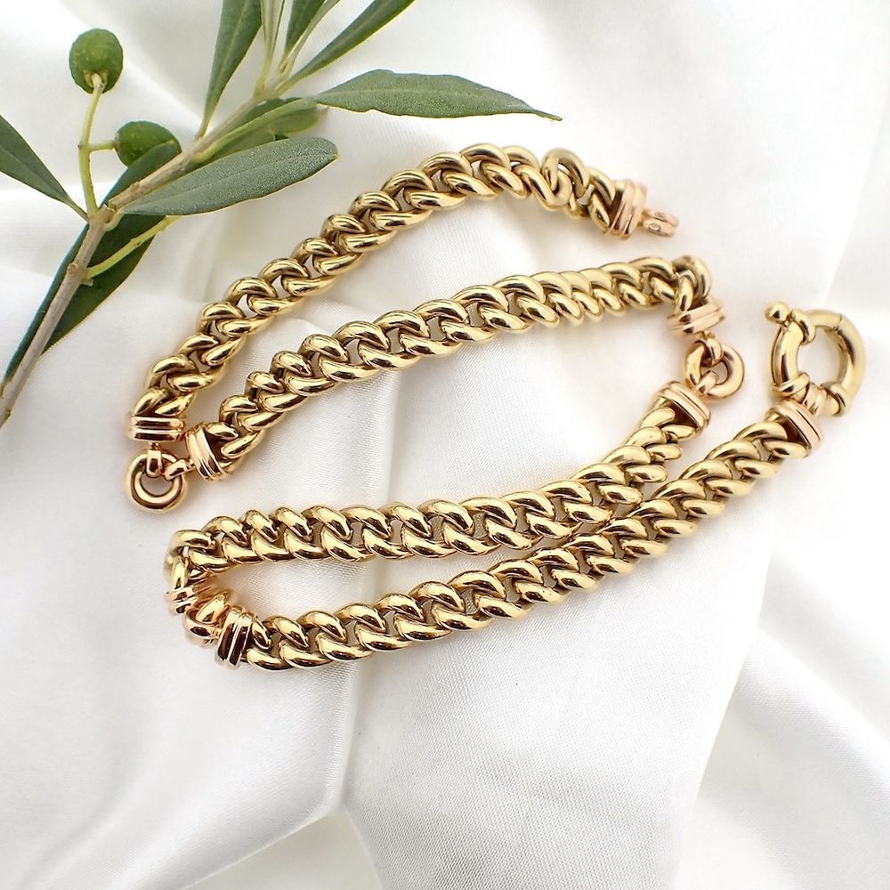 Two-tone gold necklace made with hollow gourmet links. The links are interspersed every 9 cm with a rose gold spacer. The necklace has a robust design and is crafted from 14-karat rose and yellow gold (585/1000).