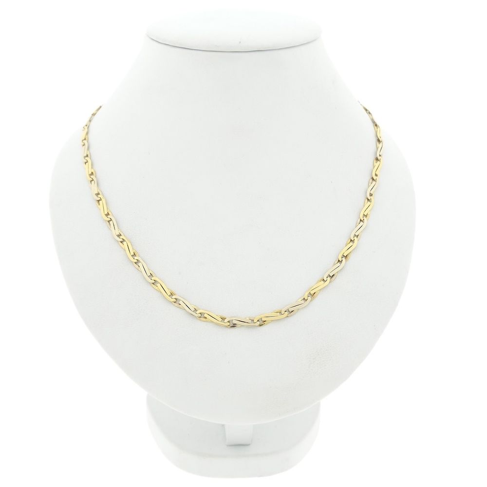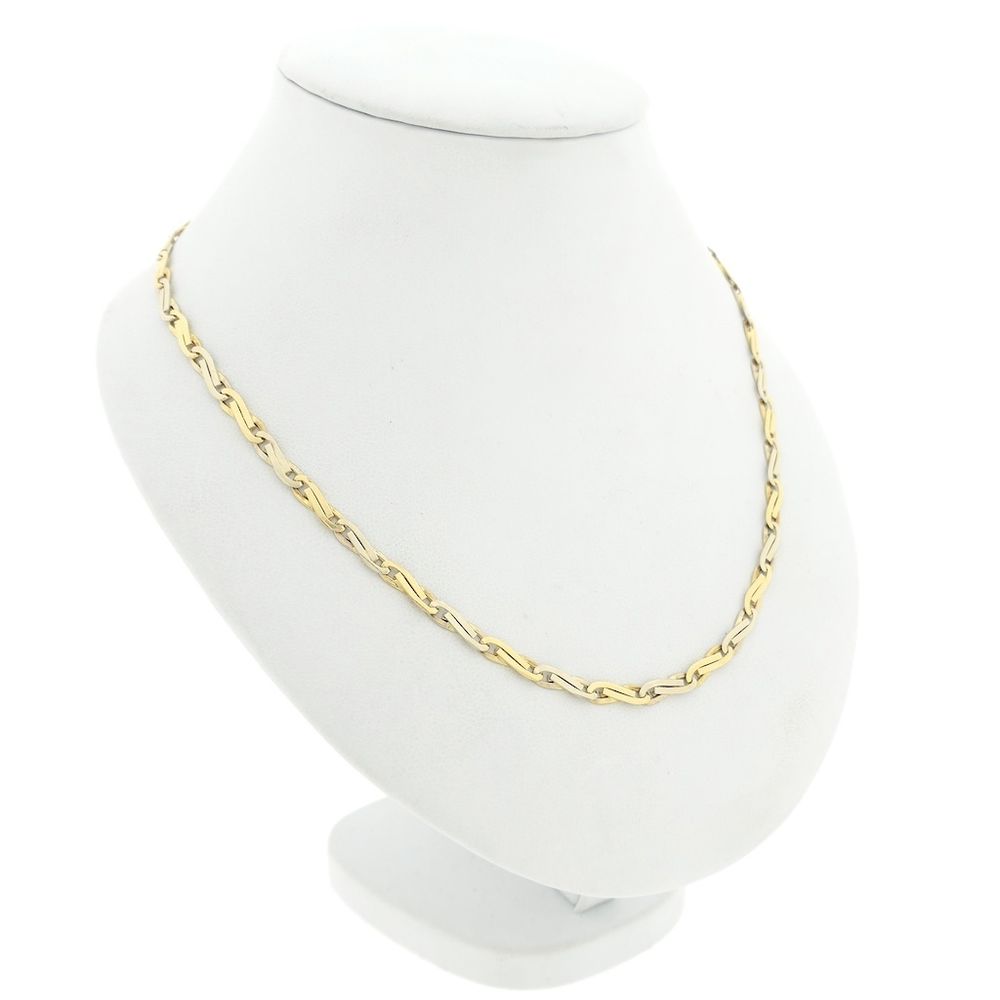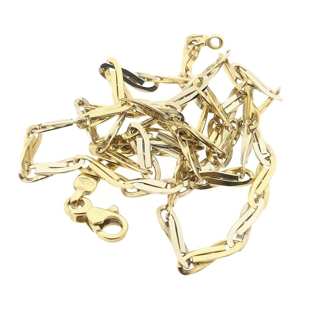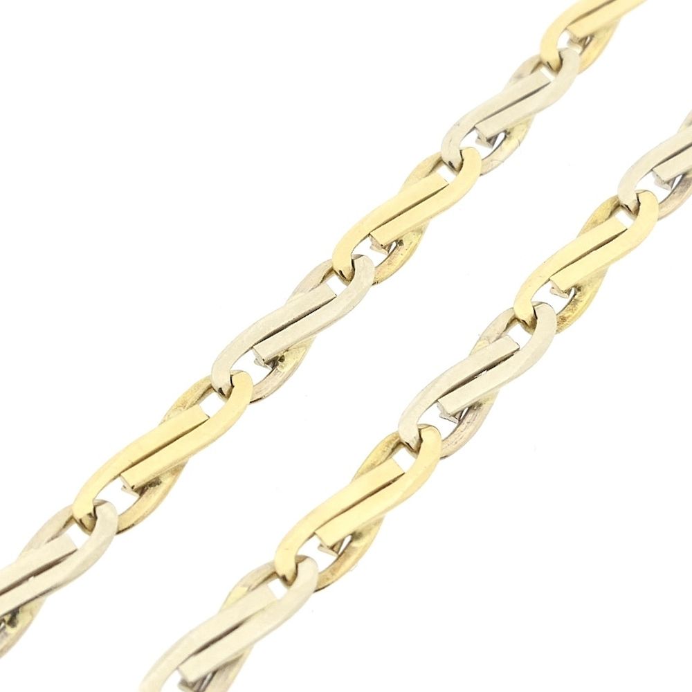 Two-tone gold infinity link necklace. This chain features infinity symbols (figure-eight loops). The link is solid and has a rugged, timeless look. The necklace closes with a lobster clasp and is crafted from 14-karat white and yellow gold (585/1000).