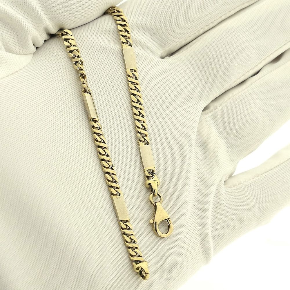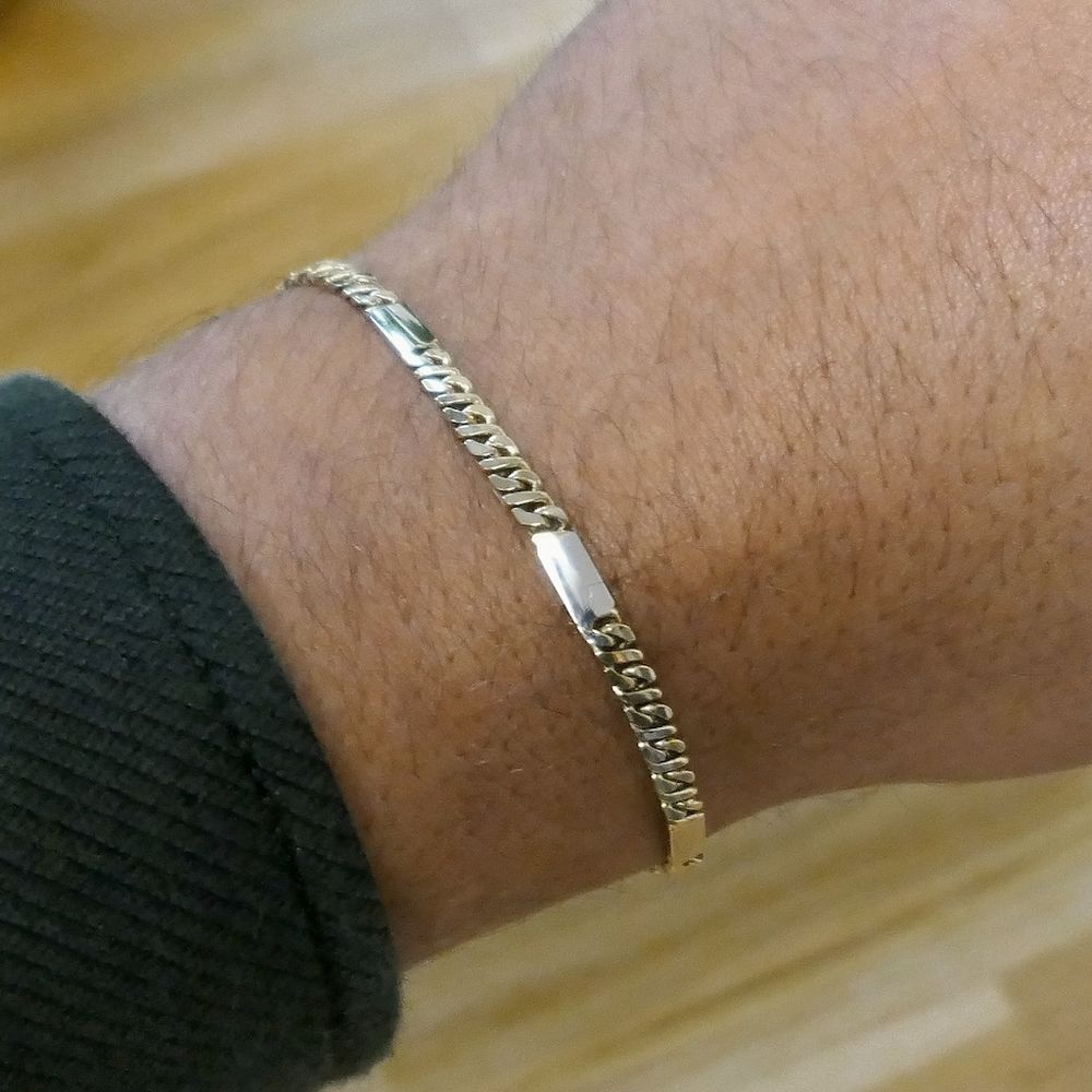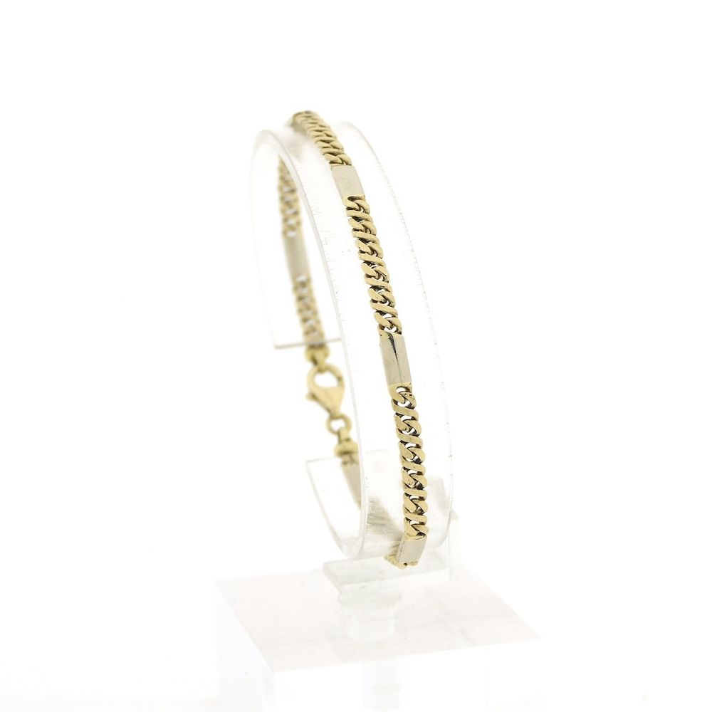 Two-tone gold bracelet with decorative links. This piece has a rugged look with a glossy finish. Every five yellow gold links are interspersed with a single white gold link. A subtle bracelet for men. The piece closes with a lobster clasp and is crafted from 14-karat white and yellow gold (585/1000).
