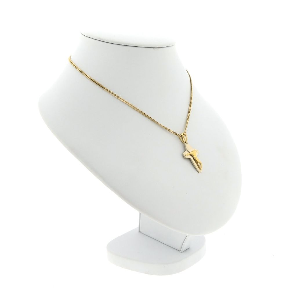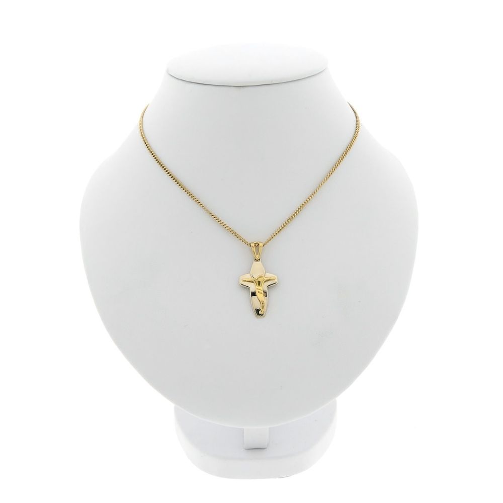Two-tone gold pendant of a cross of Jesus with an abstract corpus. The pendant is made of 14-karat white and yellow gold (585/1000).